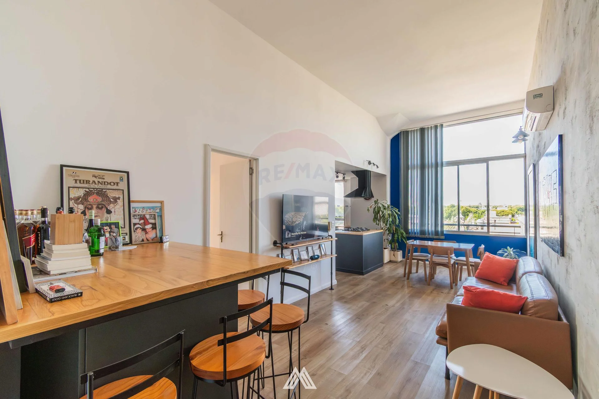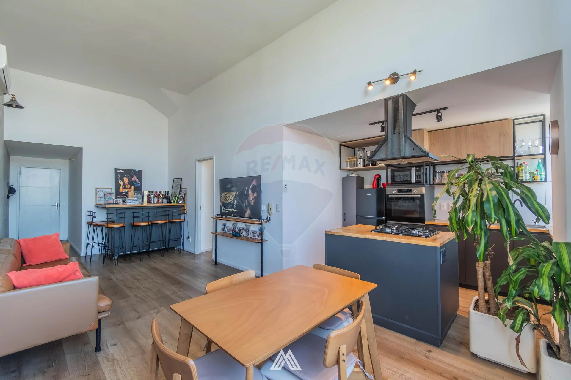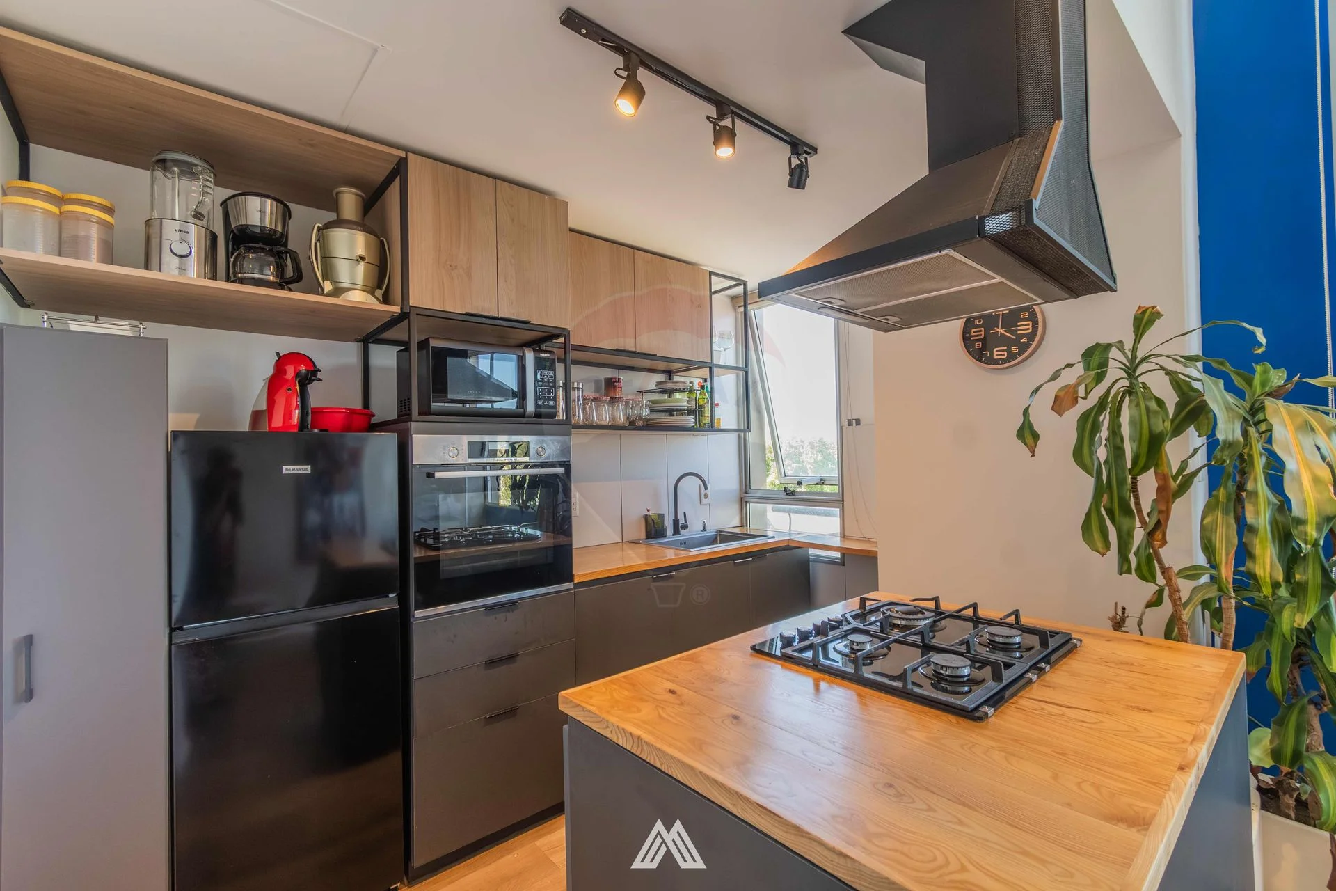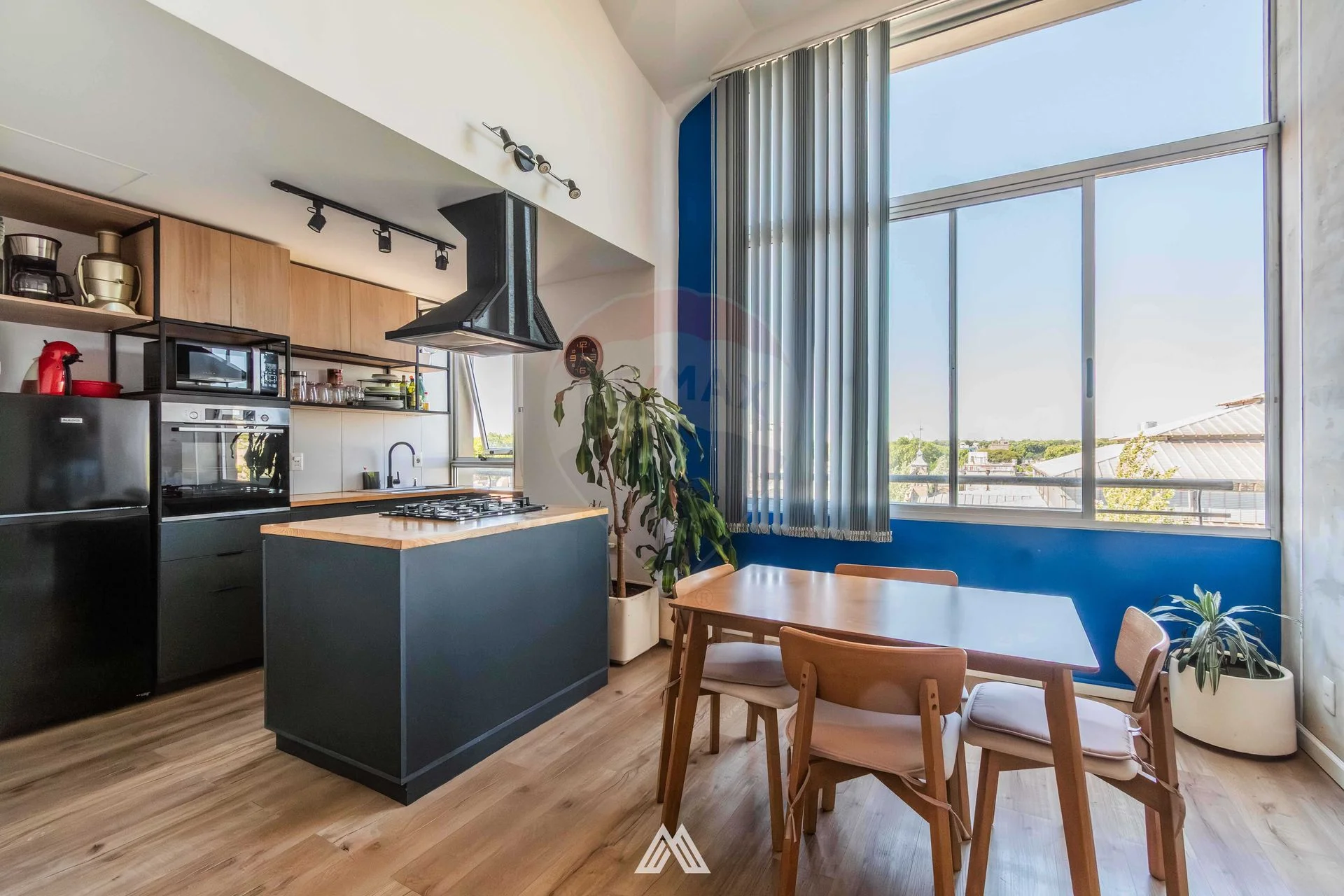 - Cocina semiintegrada, con horno empotrado e isla de madera.