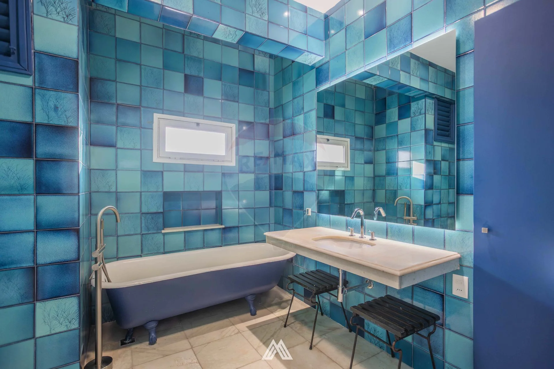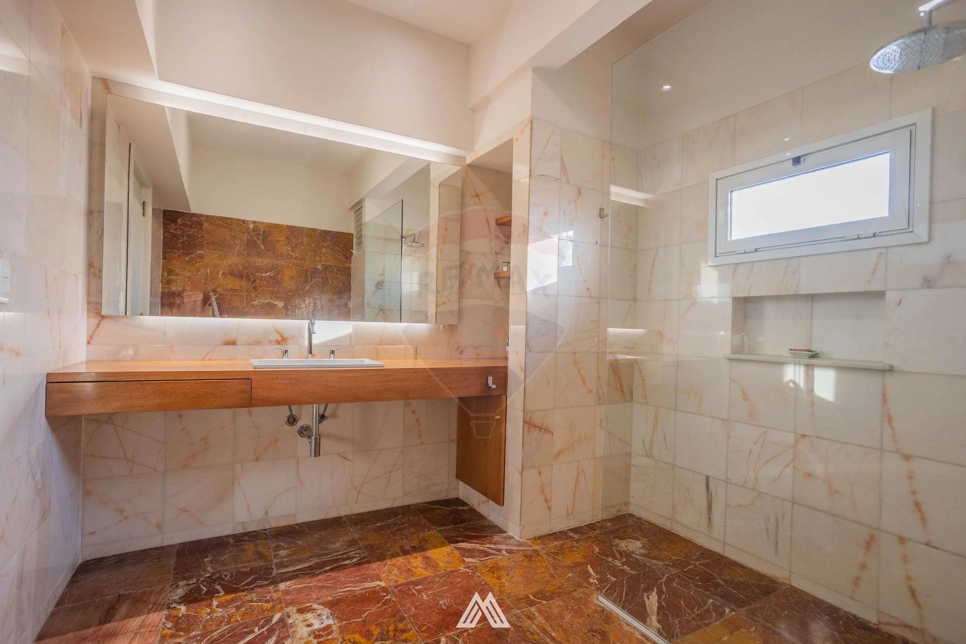 Dos baños completos, uno de ellos con el piso y paredes en mármol y el otro con piso de mármol, revestimiento en cerámica y bañera.