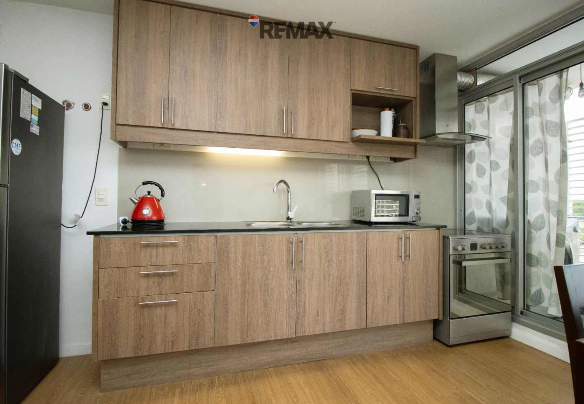 Cocina integrada, funcional y moderna con muebles bajo y sobre mesada y doble pileta de acero