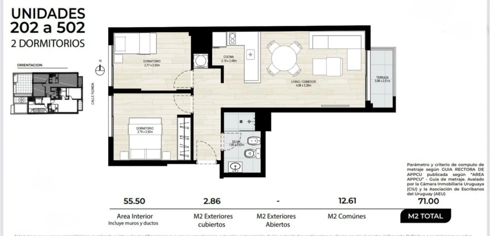 El departamento se ubica sobre la calle Florida, a menos de 2 cuadras de la rambla, en el piso 3 de un edificio de 6 pisos. Cuenta con una superficie total construida de 71 m², distribuidos en 56 m² cubiertos, 3 m² semicubiertos y 13 m² descubiertos.