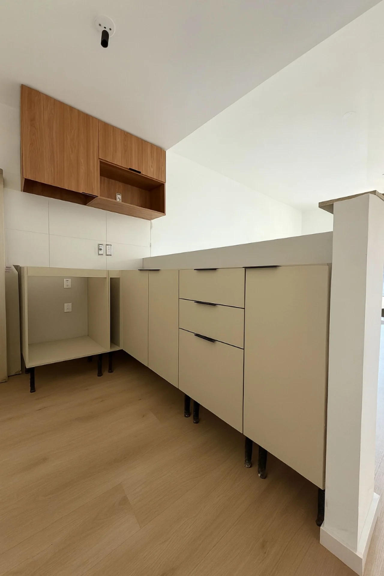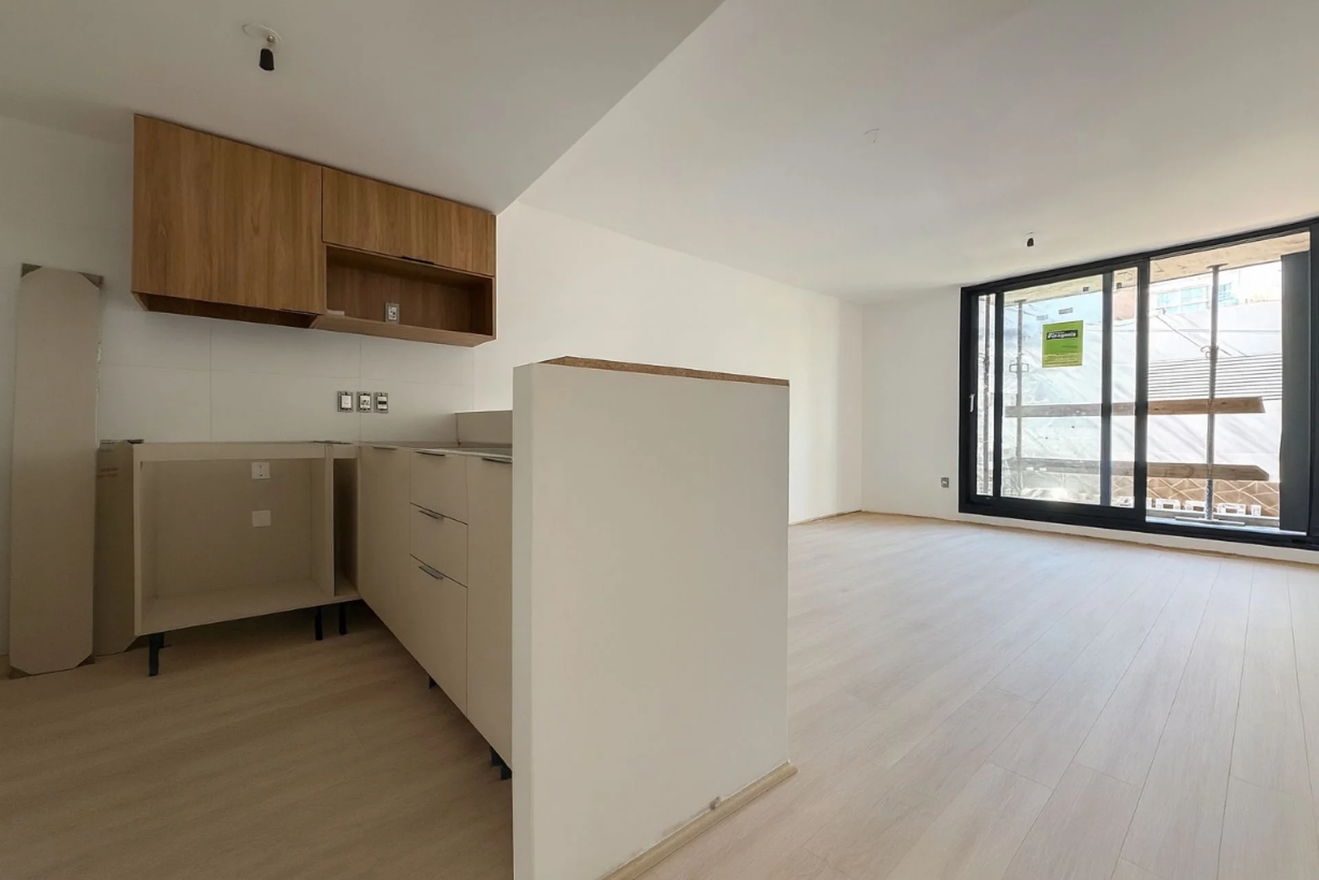 El living se orienta hacia el frente y tiene salida a un balcón de 3 m2. La cocina es integrada y se entrega con mueble sobre y bajo mesada. Cuenta con un mueble para colocación de lavarropas en la cocina.