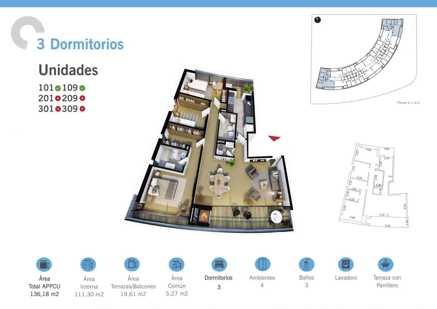 Cocina definida equipada con horno, anafe y campana Samsung, mesadas de cuarzo, y previsión para lavavajillas. Pisos de madera de ingeniería en dormitorios y living, cortinas eléctricas LEGA y calefacción por losa radiante eléctrica en todos los ambientes (incluidos los baños). Aire acondicionado central Samsung con control individual en cada habitación. Cuenta con 3 dormitorios, todos con placares y el principal en suite con vestidor. Los baños están revestidos con porcelanato italiano y grifería FV, incluyendo un toilette de visitas. La unidad incluye terraza con parrillero y terraza lavadero.