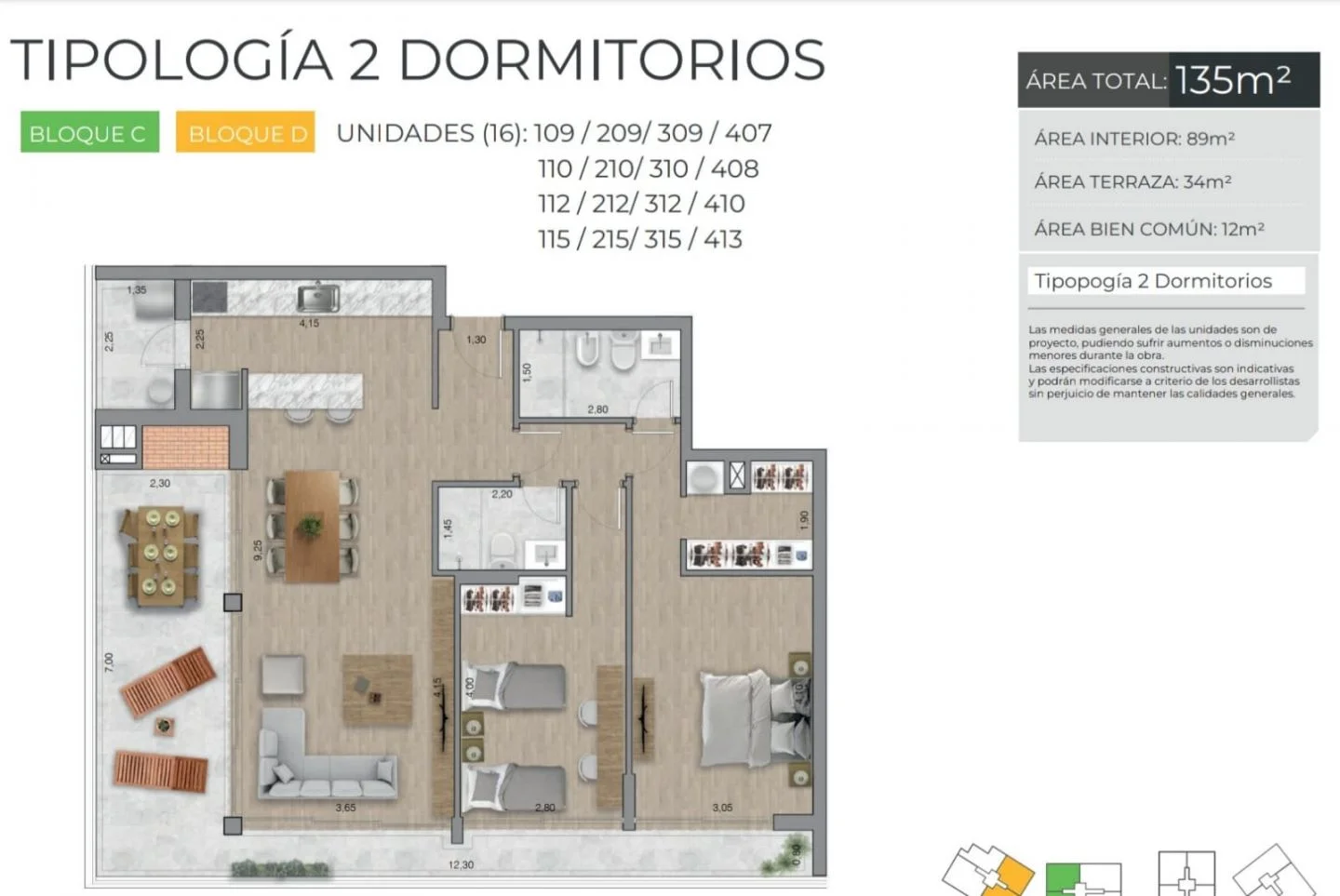 La unidad 210 de 2 dormitorios cuenta con un área interior de 89 metros cuadrados y terraza de 34 metros cuadrados.