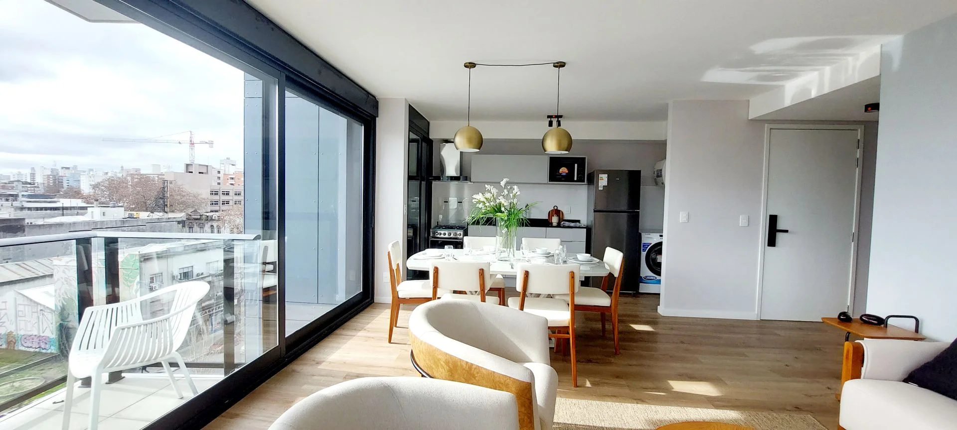 El apartamento cuenta con living comedor en esquina con grandes ventanales y salida a terraza. Cocina integrada con mueble aéreo y bajo mesada, conexión para calefón y lavarropas y salida a terraza de servicio. Hall de distribución con posibilidad de armar un escritorio o despojador. 3 dormitorios, el principal en suite. Segundo baño completo con mueble bajo mesada y espejo. Aire acondicionado en living y previsión en dormitorios. Pisos de listones vinílicos de alto tránsito símil madera, y porcelanato en baños y terrazas. Aberturas de aluminio color negro, DVH y persianas. Cerradura digital con código, tarjeta o huella.
