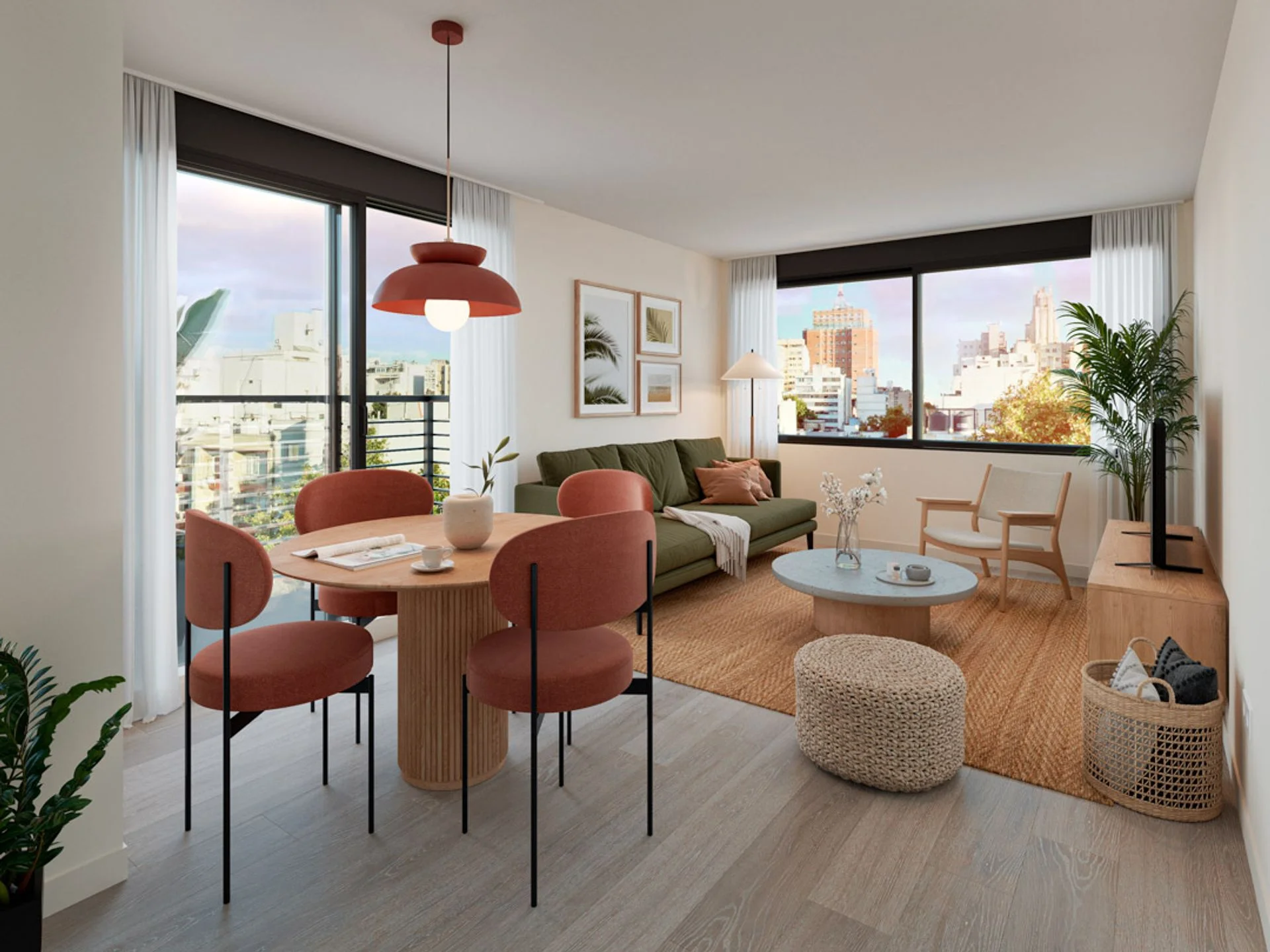 Unidad 401. Acceso mediante cerradura electrónica. Hall de acceso. Living comedor al frente con terraza. Cocina semi definida con muebles aéreos y bajo mesada. Terraza de servicio. Previsión para aire acondicionado y persiana. Pavimento vinílico de alto tránsito en listones símil madera. 2 dormitorios al frente. Baño completo con mueble bajo pileta, columna de ducha y espejo. Nicho con conexión para lavarropas.