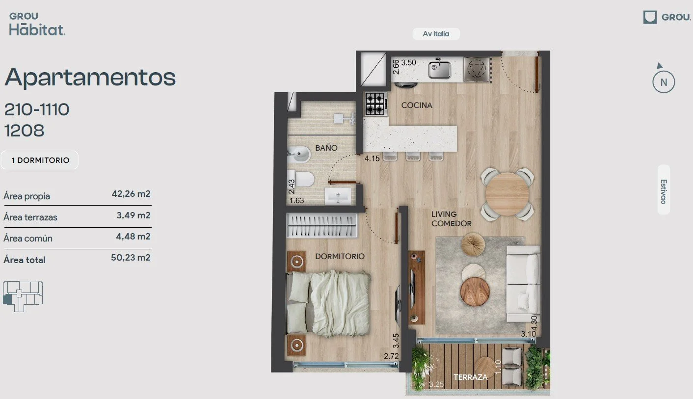 Apartamento en venta de 1 dormitorio en GROU Habitat, ubicado en Av. Italia y Estivao, excelente punto en Parque Batlle zona de gran accesibilidad, con movilidad a cualquier parte de la ciudad.