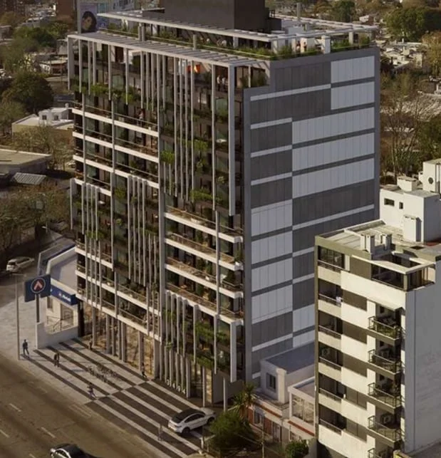 Rodeado de servicios, a pasos de hospitales, shoppings, centros educativos y el parque. Edificio moderno orientado al Norte con gran frente sobre la avenida, proyectado en 12 pisos con 10 unidades por piso.