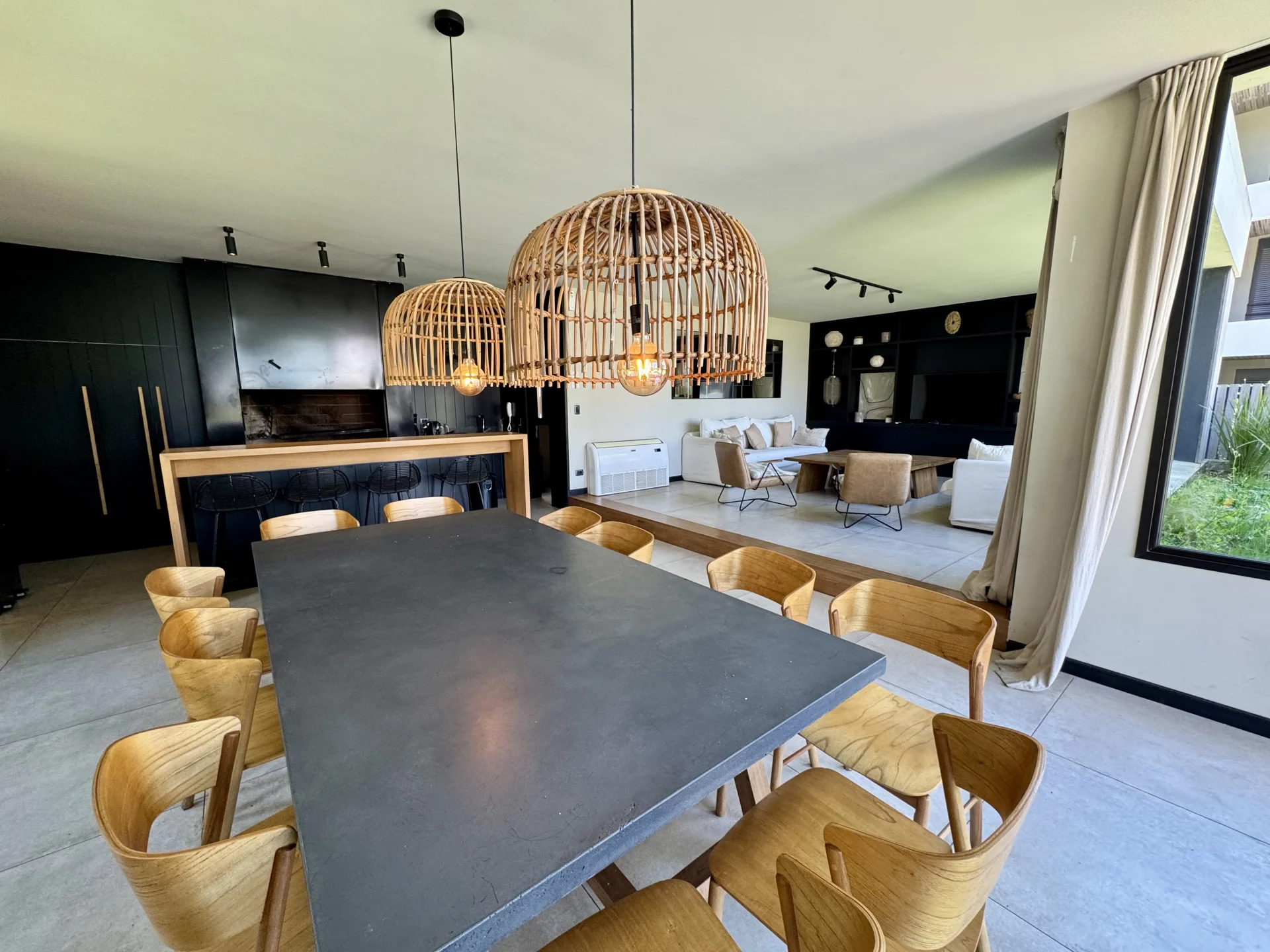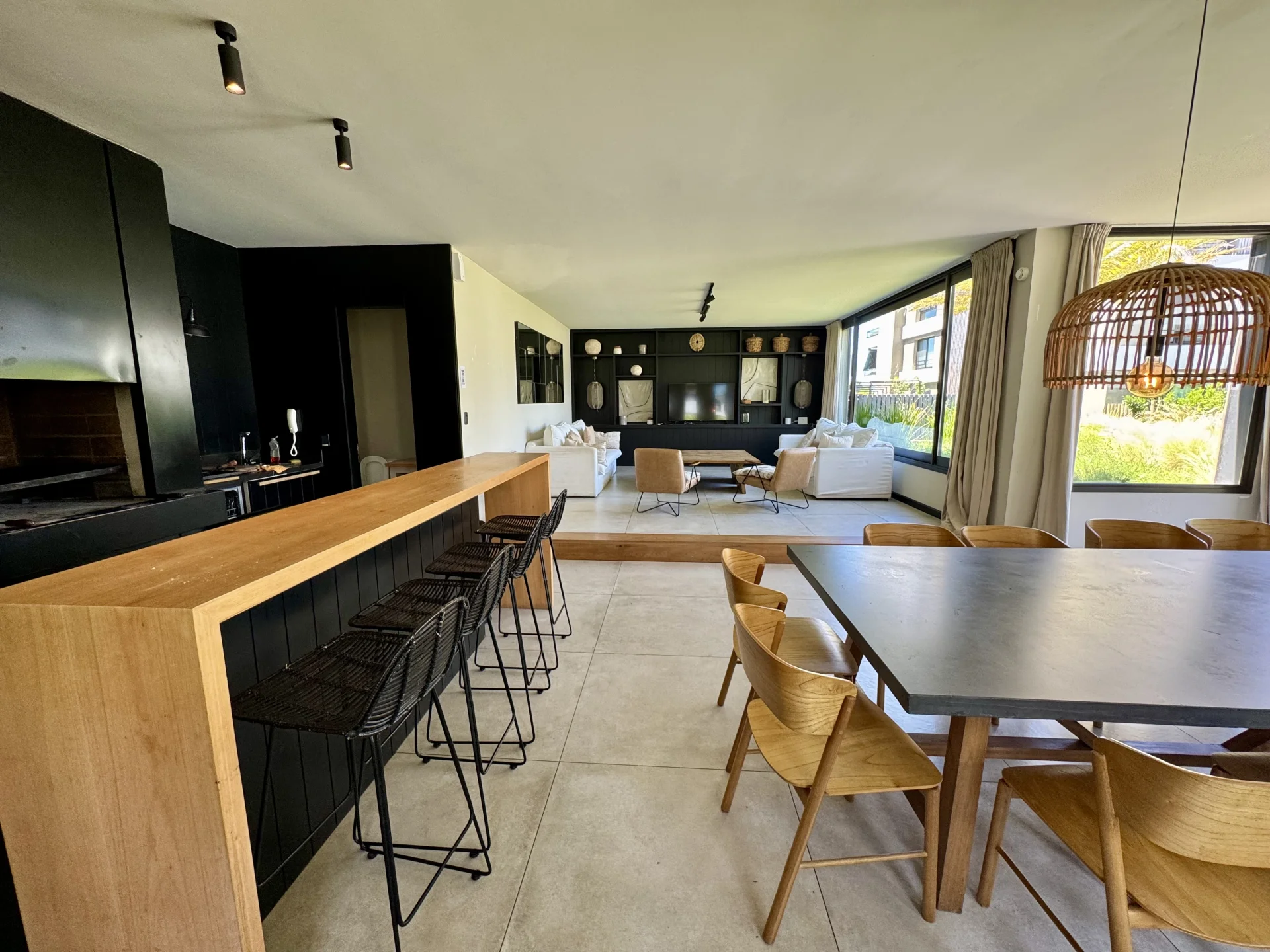 Unidad muy exclusiva: hall de entrada con despojador y toilette, amplio living-comedor con estufa a leña y grandes aberturas que lo comunican con una gran terraza con parrillero. Estas zonas comunes se encuentran hacia la mejor orientación y con una vista increíble al lago. Funcional cocina definida, equipada con horno, anafe, campana y salida a la terraza lavadero.