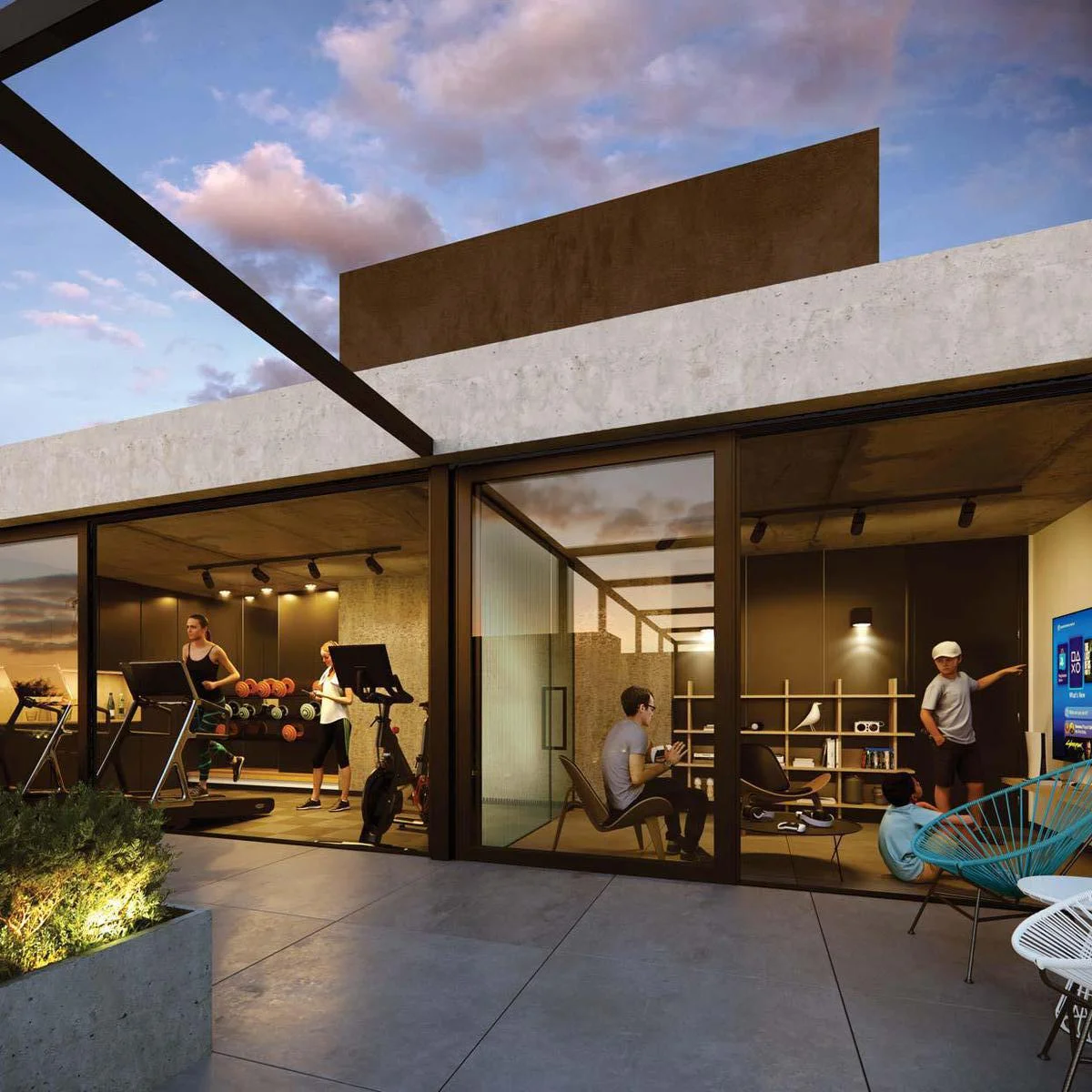 Living comedor con cocina integrada con mesada de granito y muebles bajo mesada. Acceso a terraza de uso exclusivo al frente.Anafe vitrocerámico de 2 hornallas, Campana instalada y previsión para horno eléctrico empotrado.