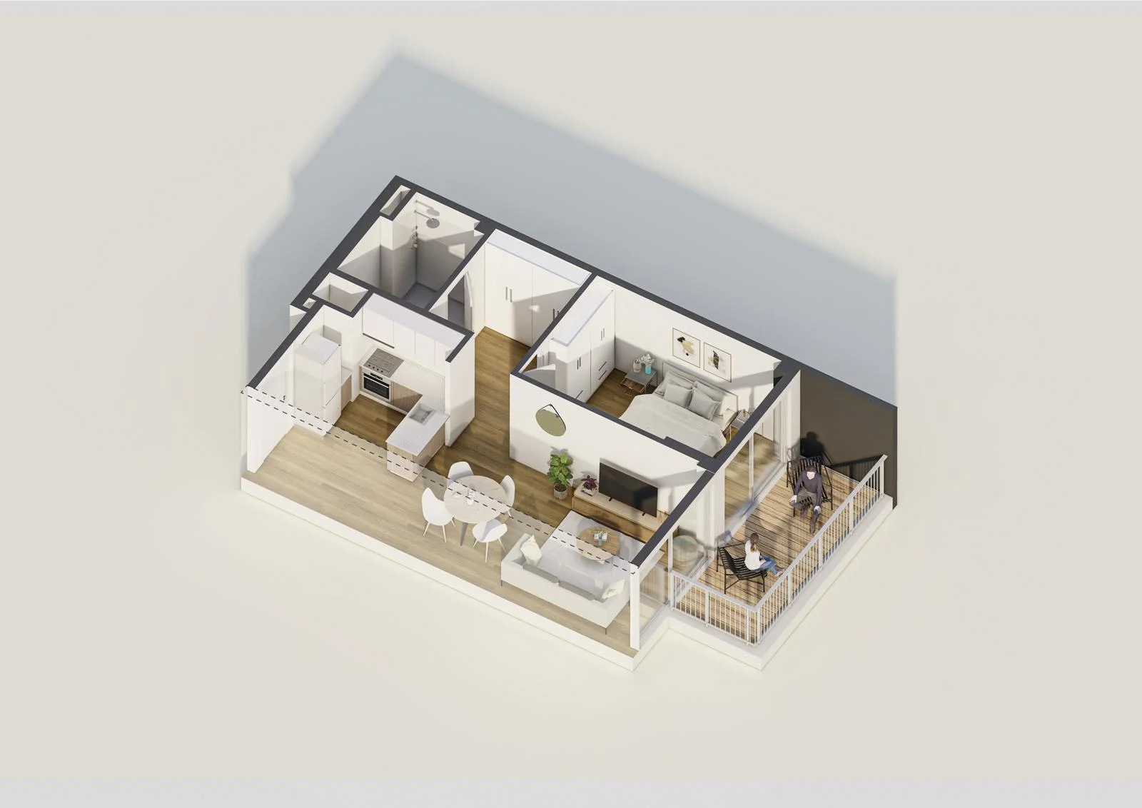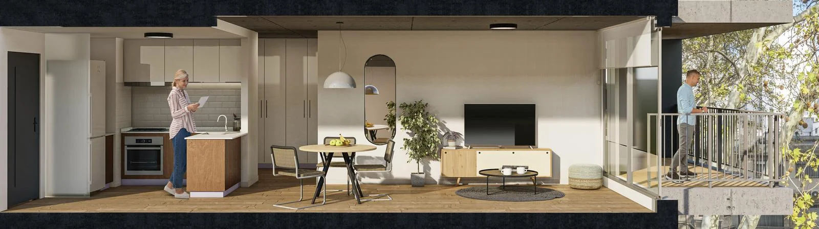 El apartamento cuenta con un diseño eficiente y moderno, maximizando el uso del espacio y proporcionando comodidad y funcionalidad.