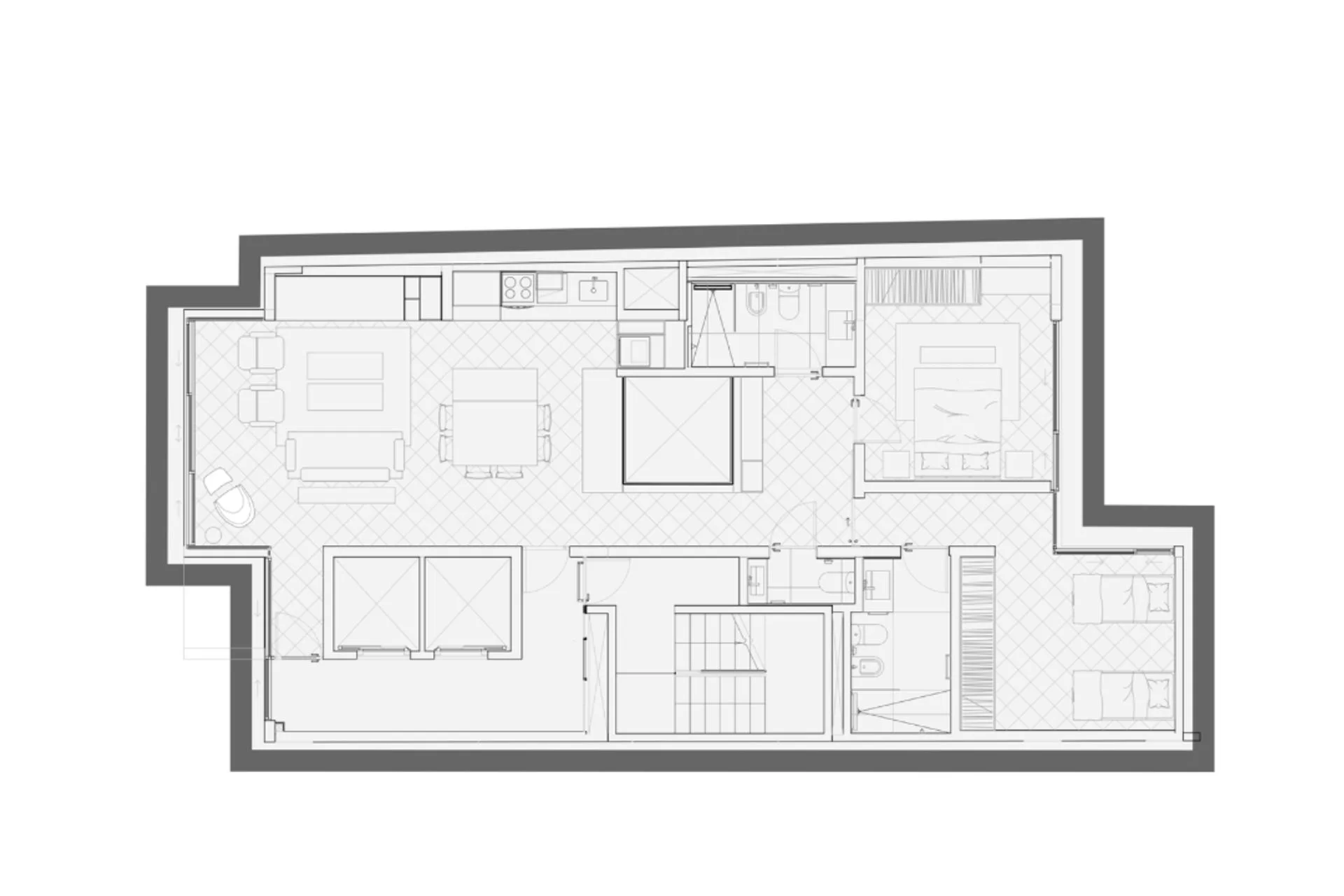 Diseñado con una volumetría innovadora, incorpora un tragaluz central que conecta y equilibra las áreas privadas y públicas de cada apartamento, maximizando la entrada de luz natural y generando ambientes cálidos, luminosos y de gran calidad espacial