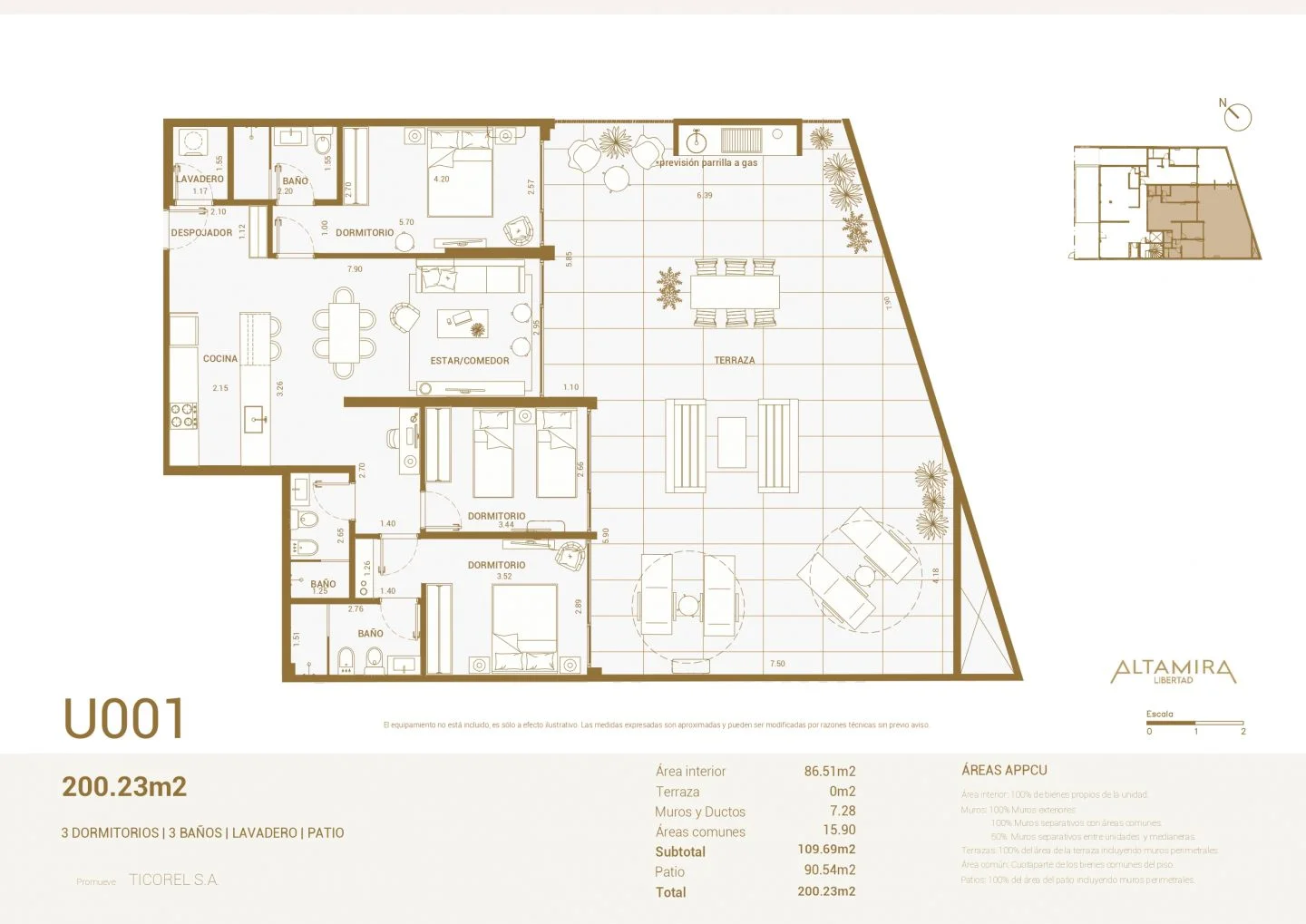 La unidad 001 se encuentra en planta baja, con superficie de 86 m2 más un patio de 90 m2, orientación Sudeste y disposición al contrafrente con vista a un muro de vegetación.