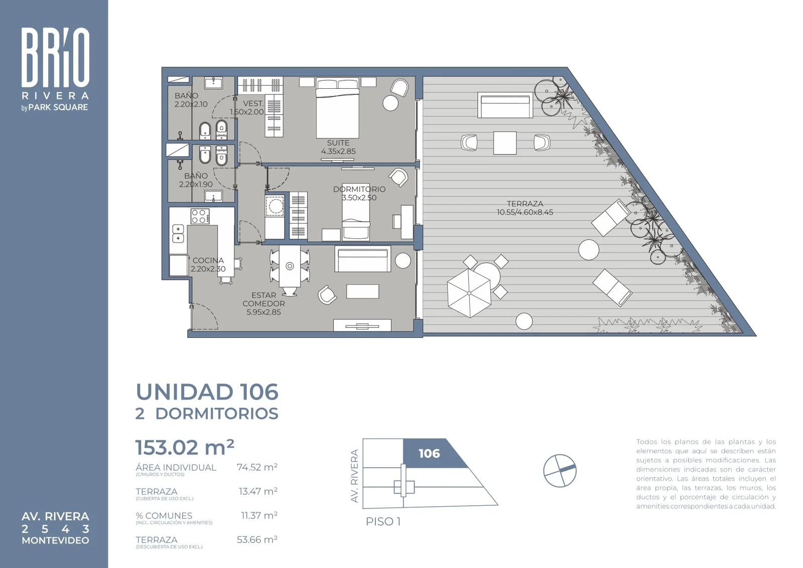 Brio Rivera se compone de 52 apartamentos, con 33 unidades de 1 dormitorio y 19 unidades de 2 dormitorios, diseñados con distribución eficiente, amplias aberturas que favorecen la iluminación natural y terminaciones de calidad. El proyecto se ubica sobre Rivera esquina Obligado, en una ubicación estratégica dentro del barrio.
