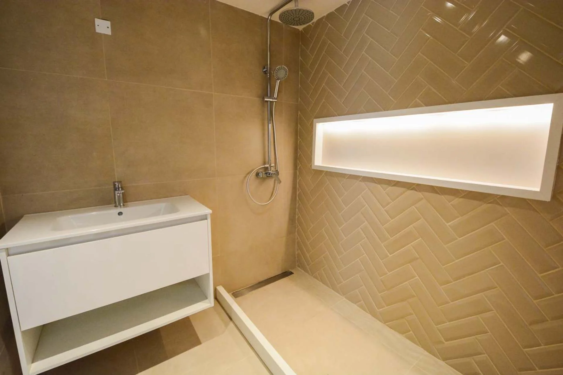 Cómodo baño completo a estrenar, con mueble flotante y ducha con nicho iluminado.