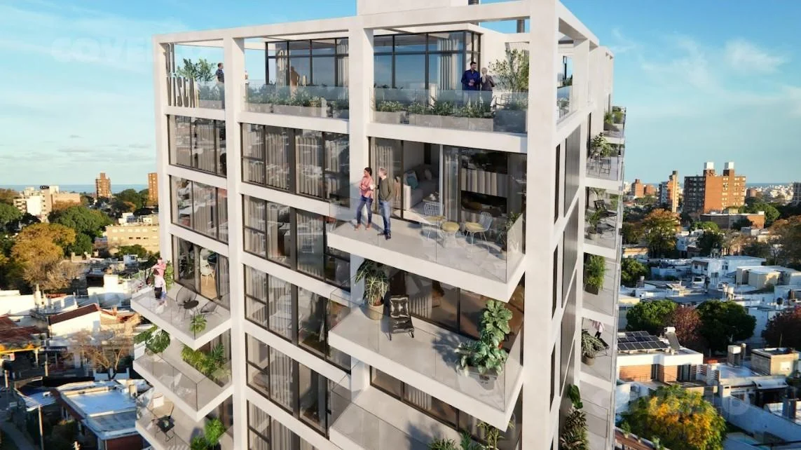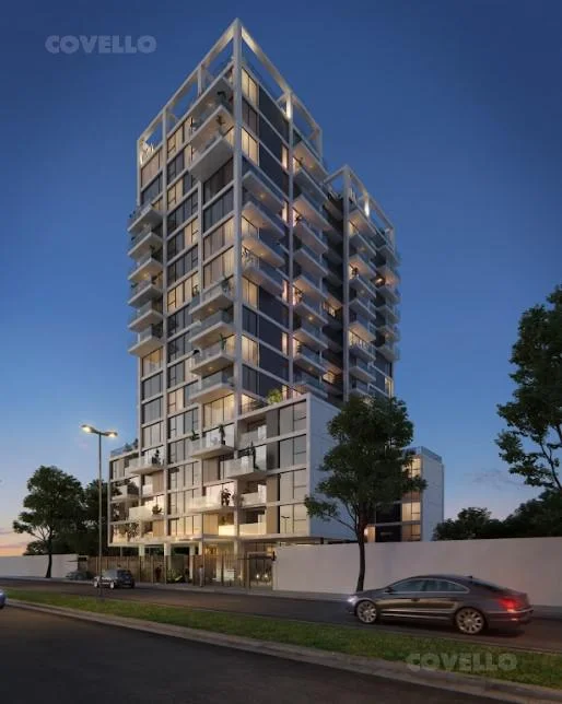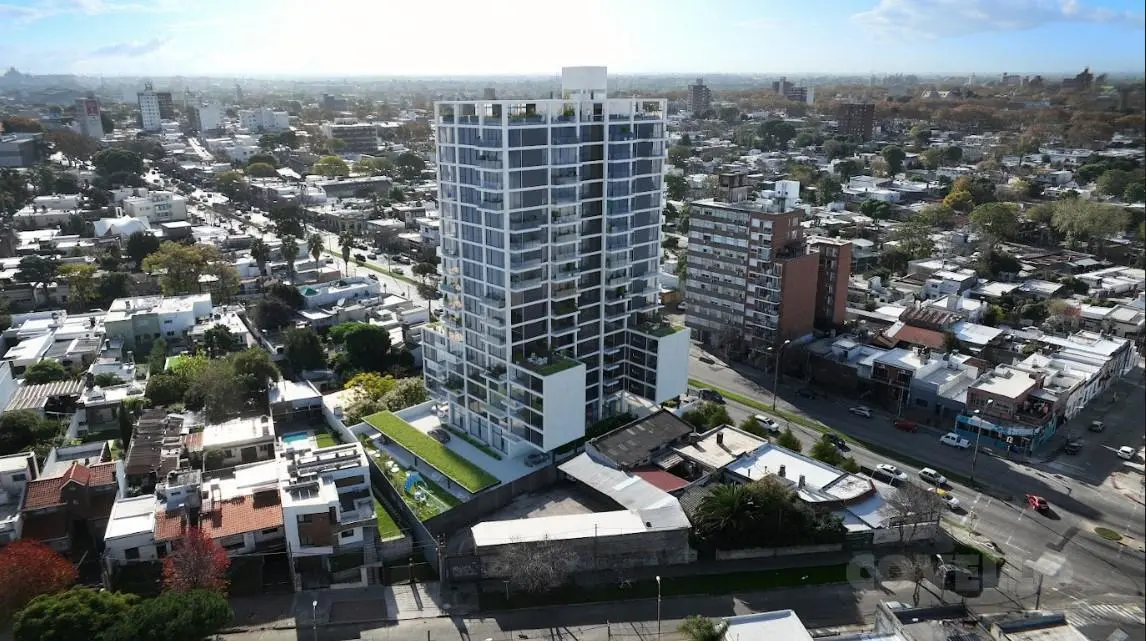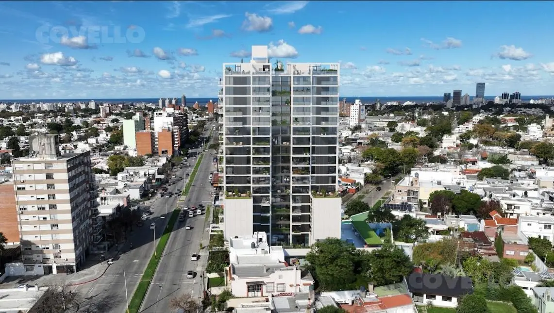 El edificio se desarrolla en 16 pisos, con 14 unidades por piso, y en planta baja y subsuelo contará con plazas de garaje.