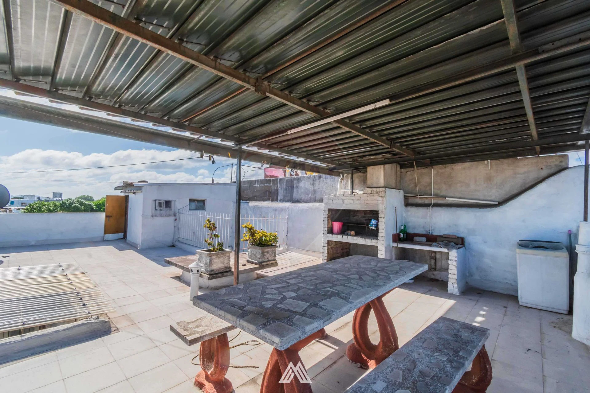 Azotea con parrillero techado, mesa y asientos de hormigón, un espacio al aire libre muy disfrutable,