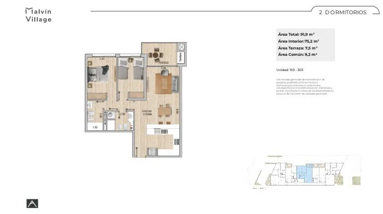 Este moderno apartamento de 2 dormitorios ofrece una combinación perfecta de confort, seguridad y funcionalidad. Disfruta de amplios espacios con acabados de alta calidad, incluyendo aberturas de aluminio anodizado con cristales doble termo-acústicos y muros exteriores en mampostería tradicional, garantizando confort térmico y acústico.