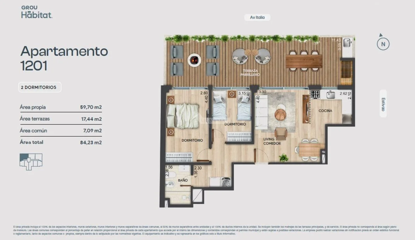 AVENIDA ITALIA Y ESTIVAO... EDIFICIO GROU HÁBITAT...A PASOS DEL DISCO DE AVENIDA ITALIA Y PROXIMO SODIMAC Y PLAZA ITALIA SHOPPING NACE UN EDIFICIO DE DISEÑO, UN HABITAT PENSADO PARA LA NUEVA ERA... ESTRENA JUNIO 2026... AL FRENTE... PENTHOUSE CON PARRILLERO... Living comedor con cocina integrada con placares aéreos y bajo mesada, salida a TERRAZA con PARRILLERO. 2 DORMITORIOS con placard y salida a la TERRAZA. 1 BAÑO completo. Previsión para aire acondicionado. El edificio cuenta con TERRAZA CON BARBACOA Y PARRILLERO, GIMNASIO, BICICLETERO, LAUNDRY, CO WORK, PLAYROOM Y PATIO ZEN. GARAJE OPCIONAL.