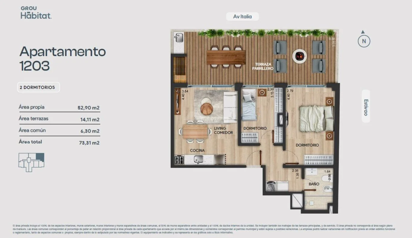 1203) 52,90m2 área propia c/muros + 6,30m2 área común + 14,11m2 terraza = 73,31m2 totales.