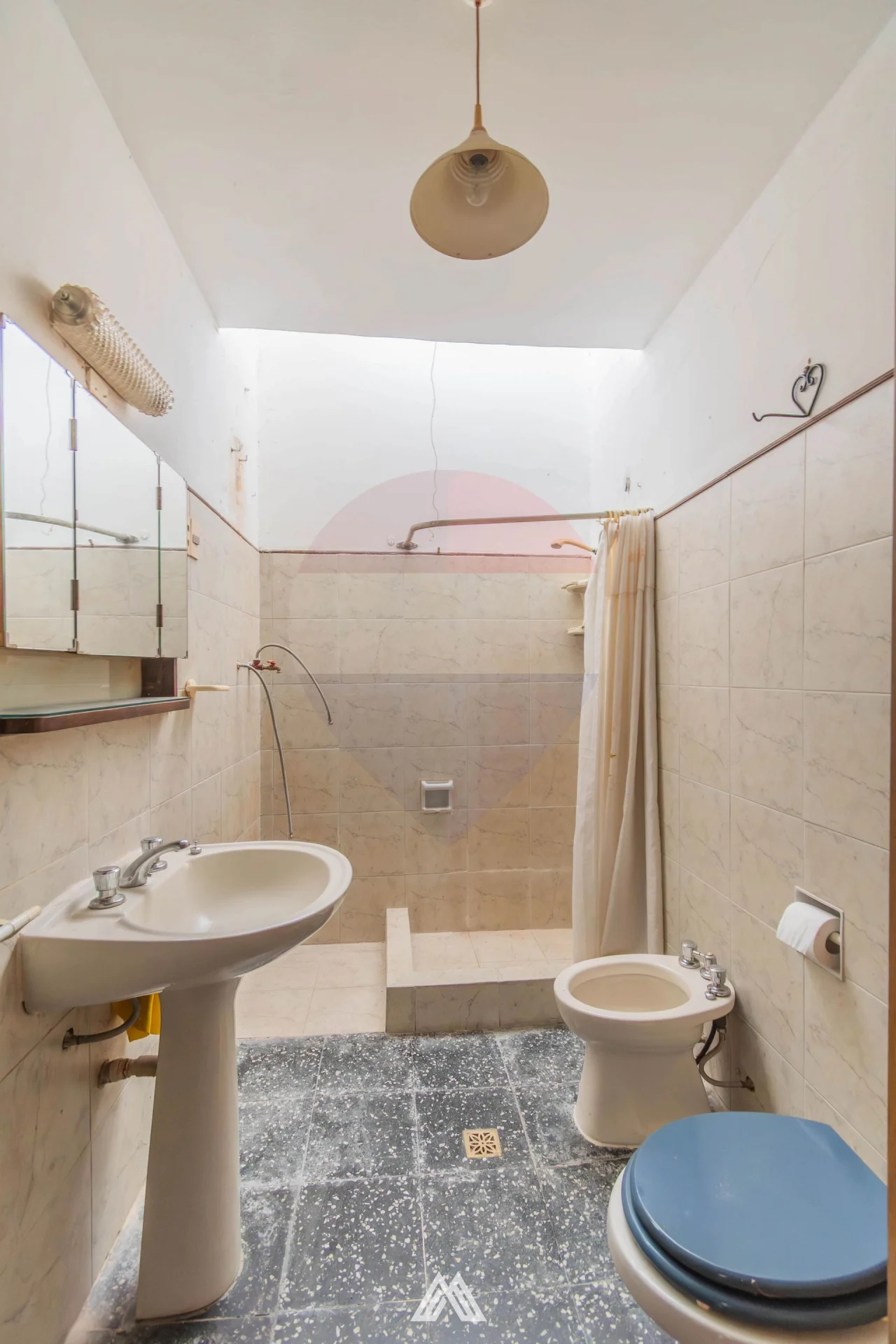 Baño amplio con claraboya que permite buena ventilación.