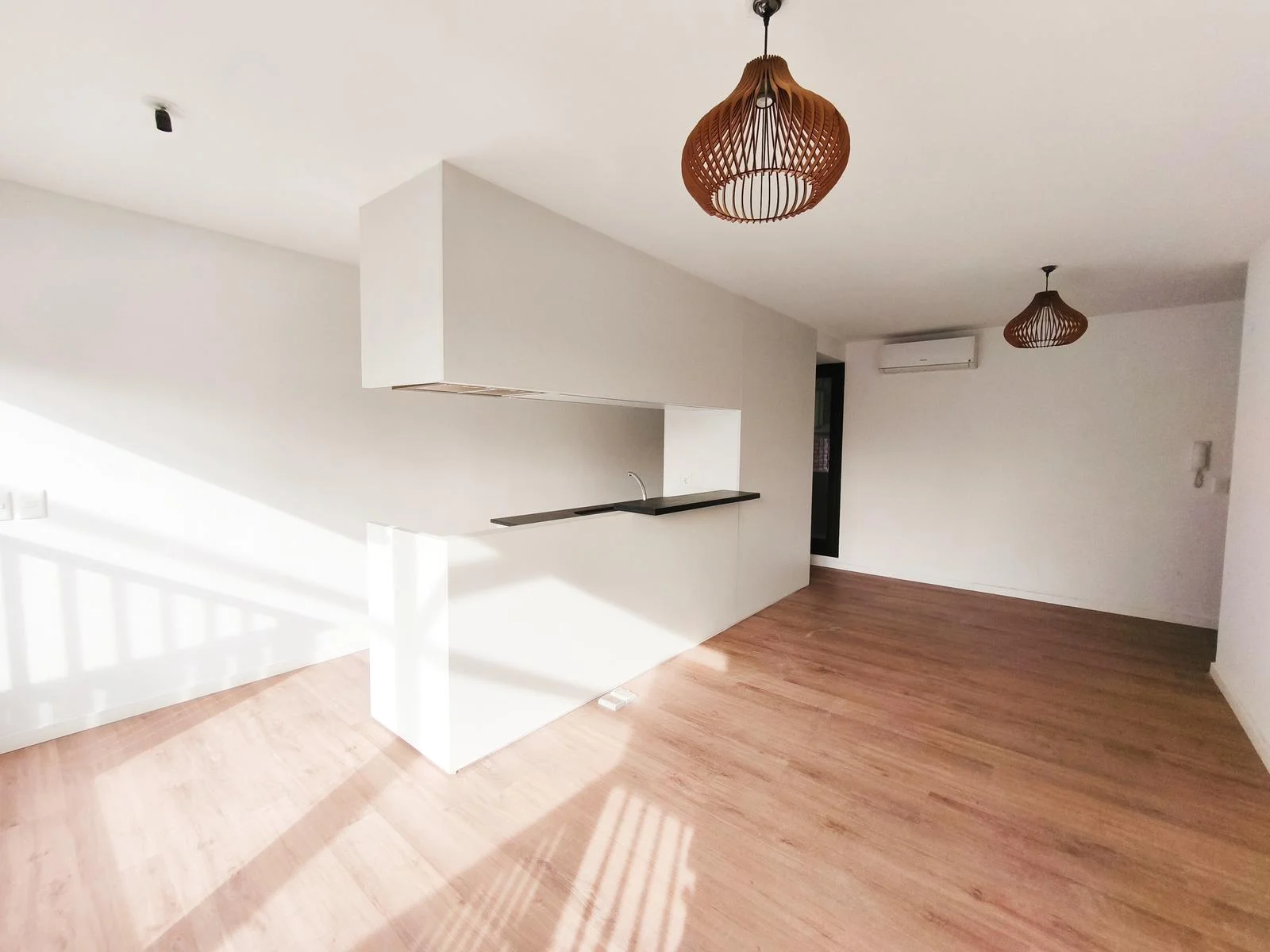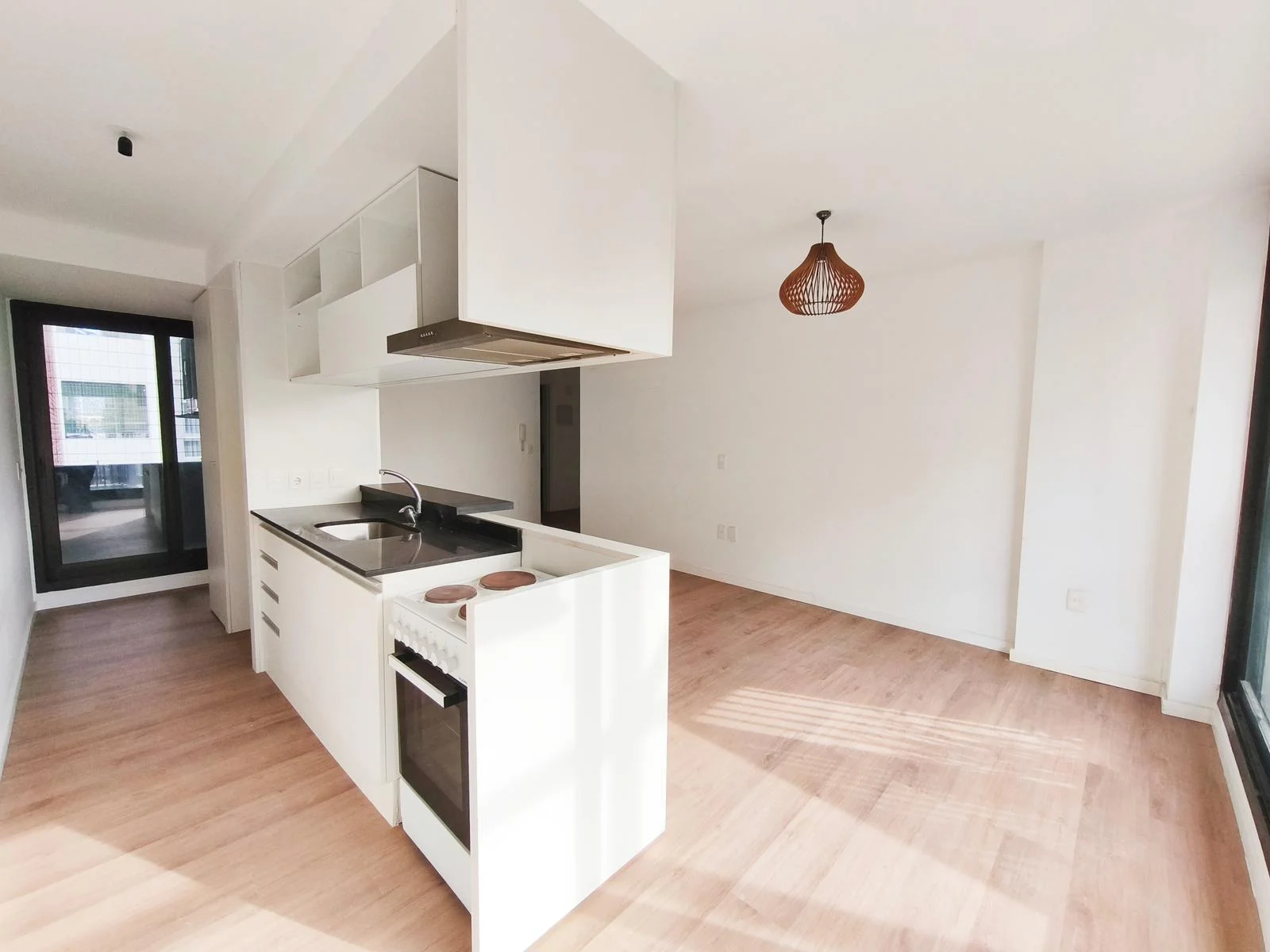 Cocina integrada diseñada con mobiliario que incorpora los electrodomésticos sin que se vean desde el área de living. Equipada con calefón, campana, cocina y aéreo.