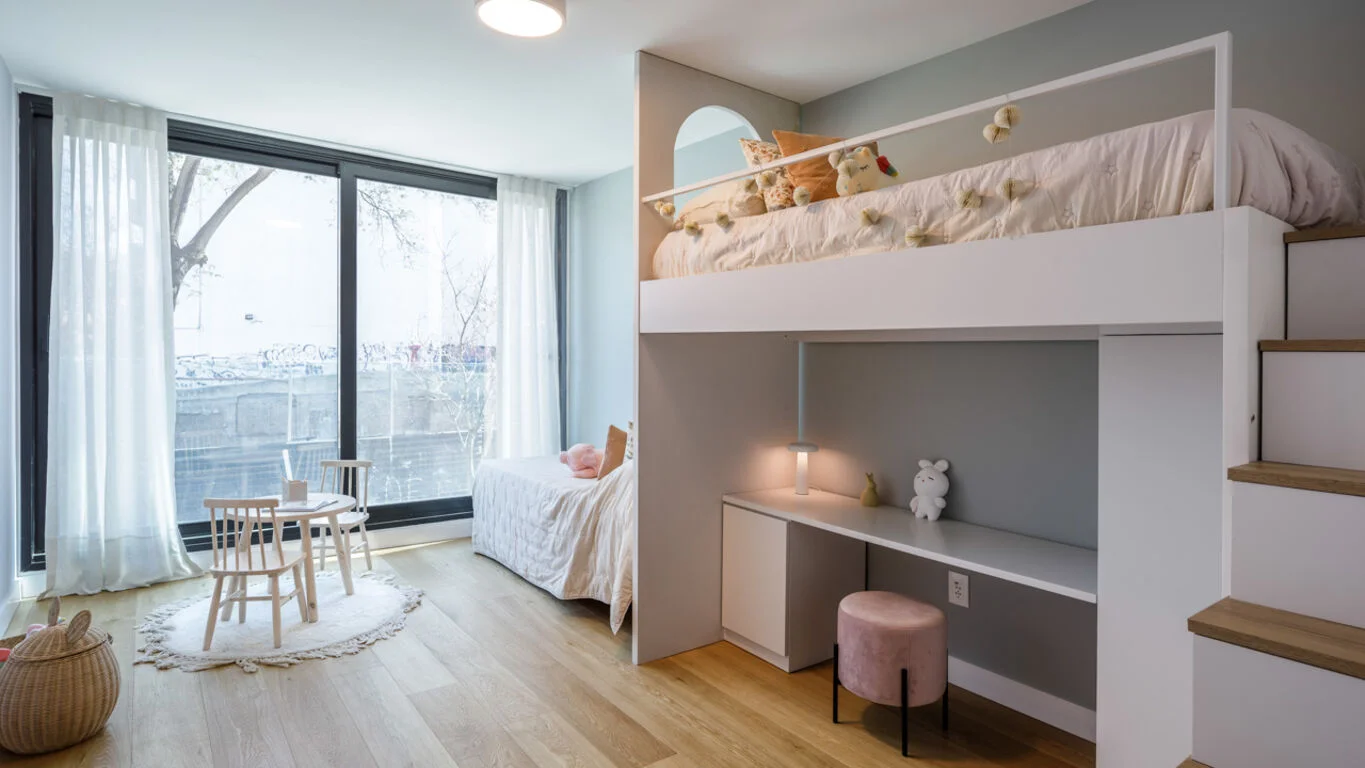 Dentro del proyecto, se destaca la unidad 106, correspondiente a una tipología de 3 dormitorios + flex, con una distribución funcional y bien resuelta, ideal tanto para uso familiar como para quienes buscan espacios adicionales de trabajo o servicio.