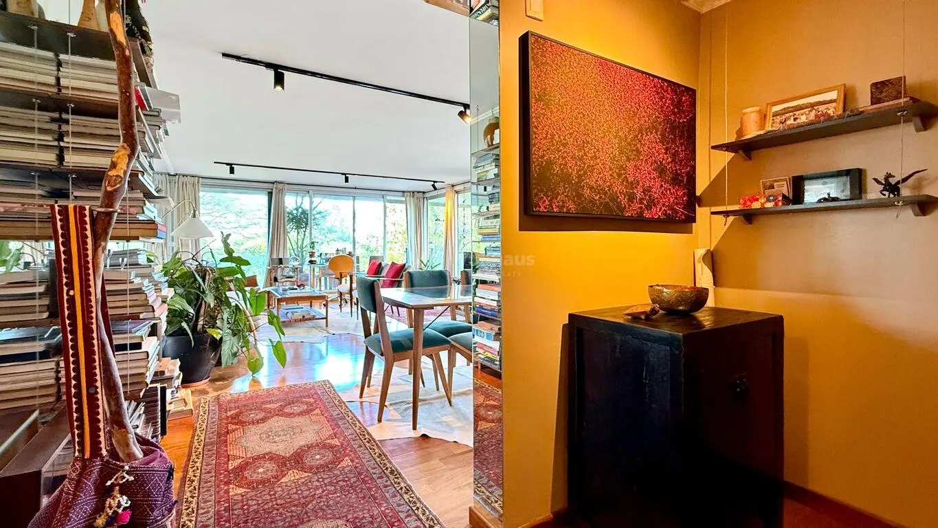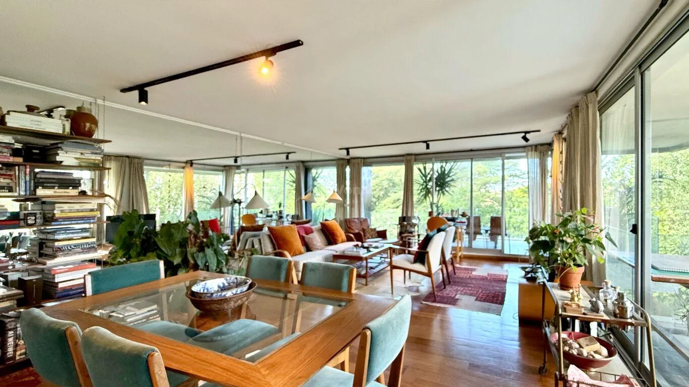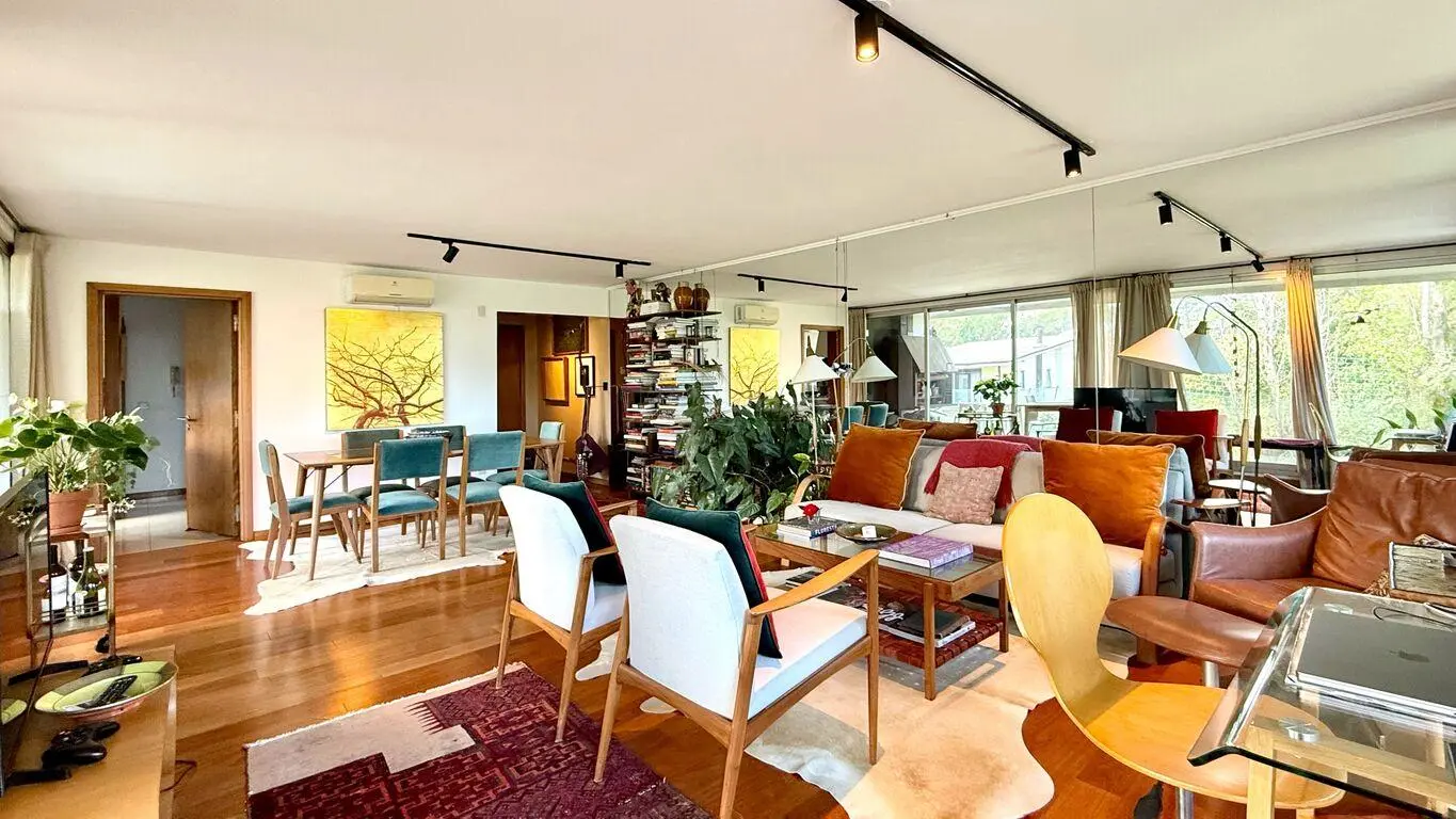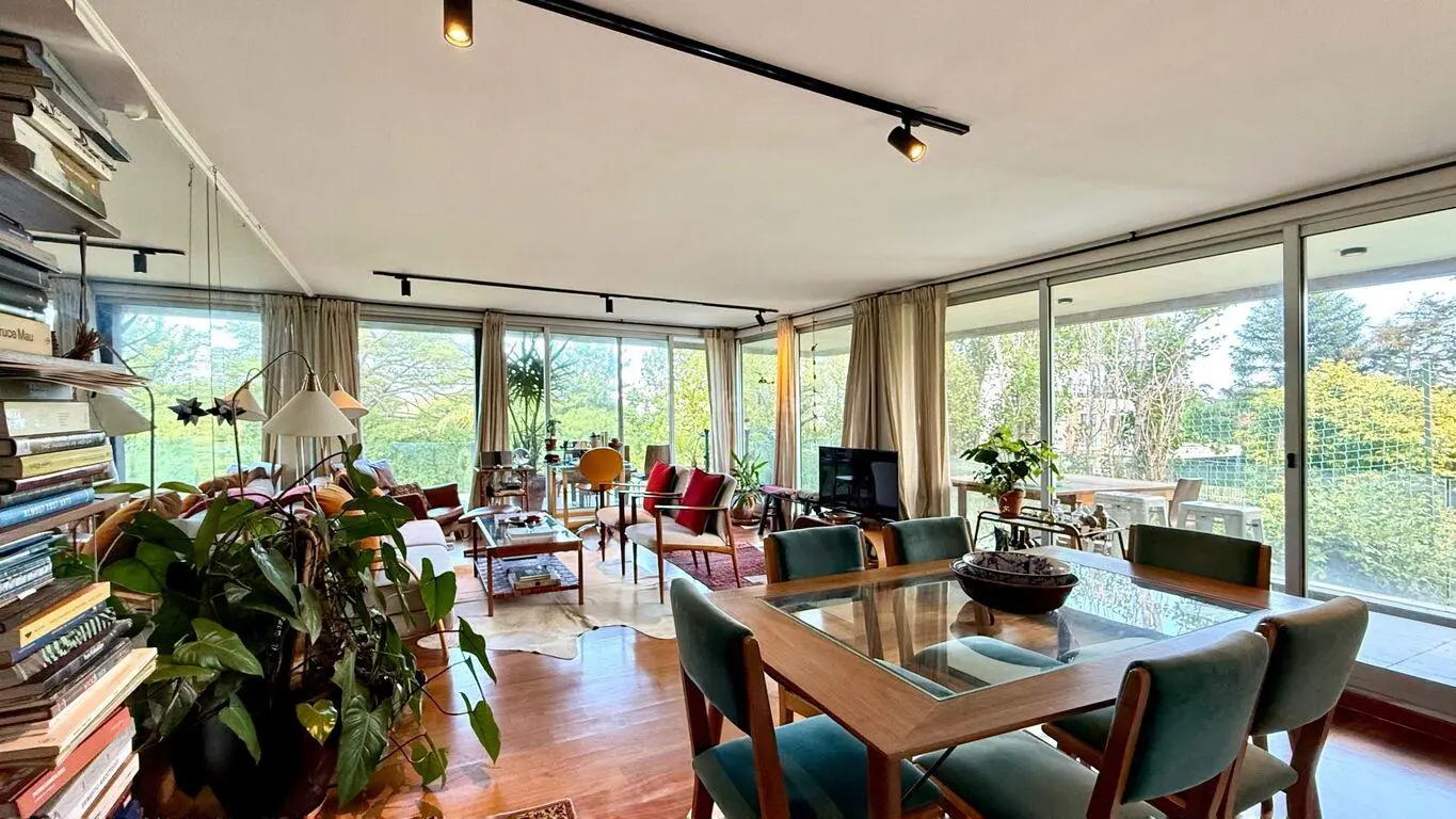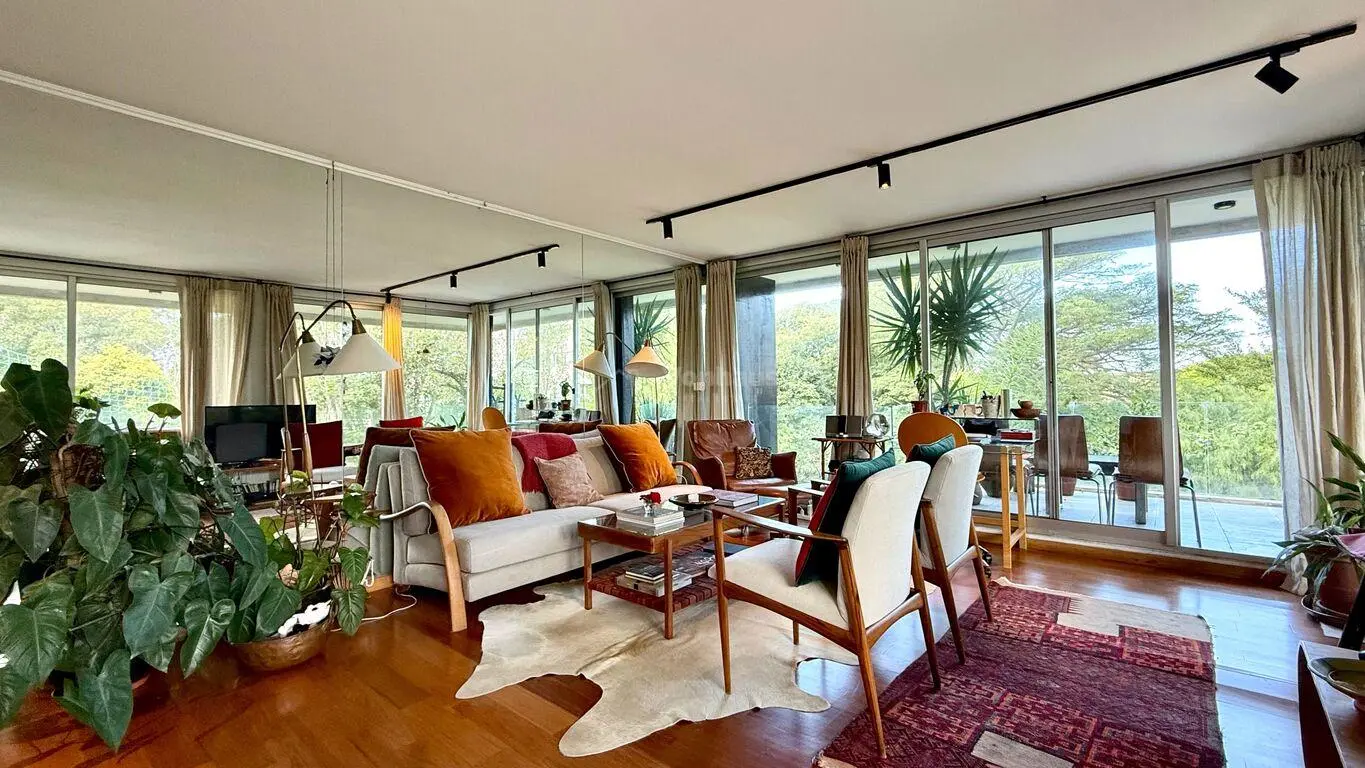 El living-comedor es un espacio amplio y luminoso, con ventanales de piso a techo lo que permite una abundante entrada de luz natural y ofrece vistas verdes despejadas de los alrededores por ser contrafrente.