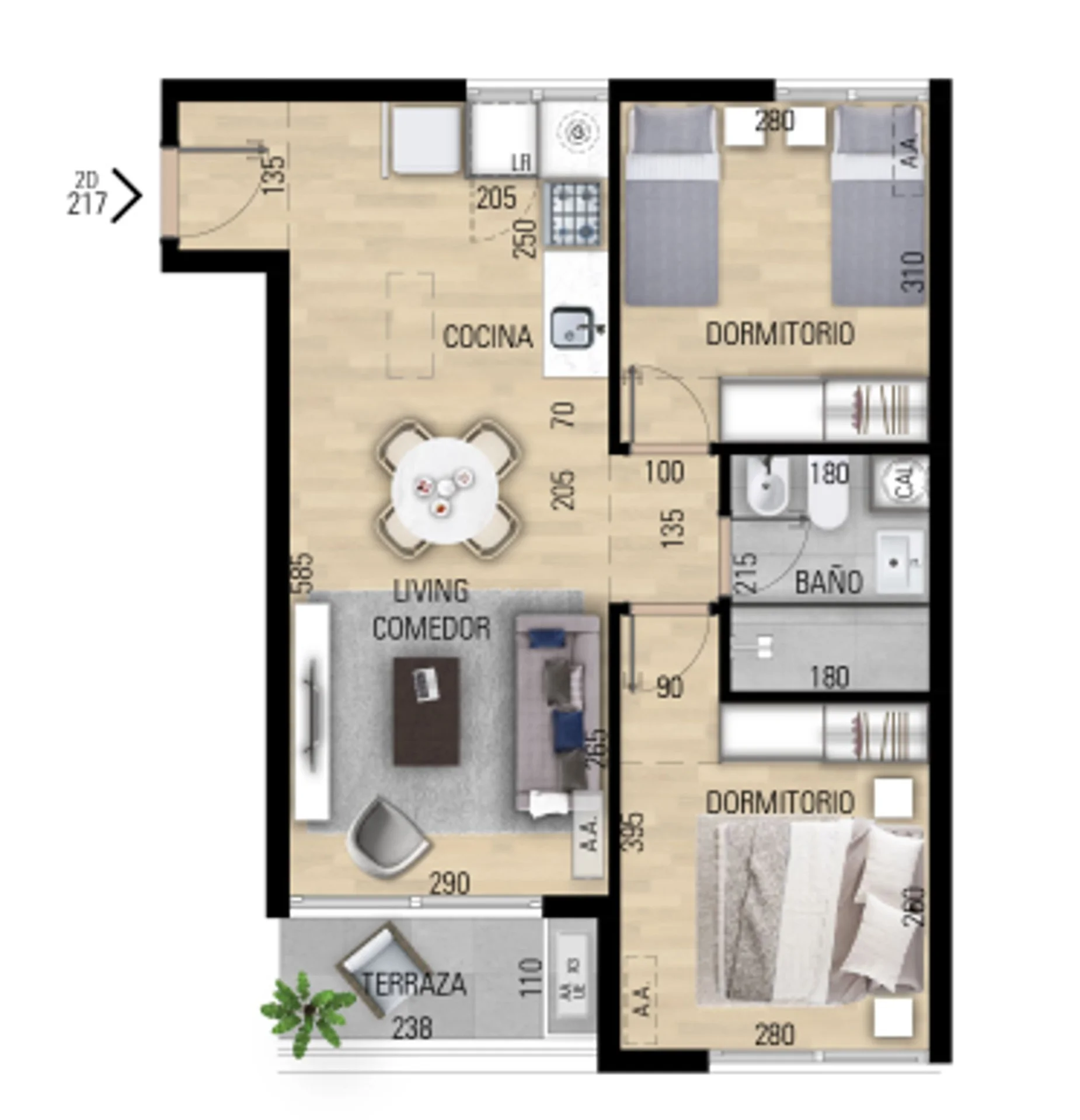 Apartamento unidad 217 en el segundo piso, con orientación Sur.