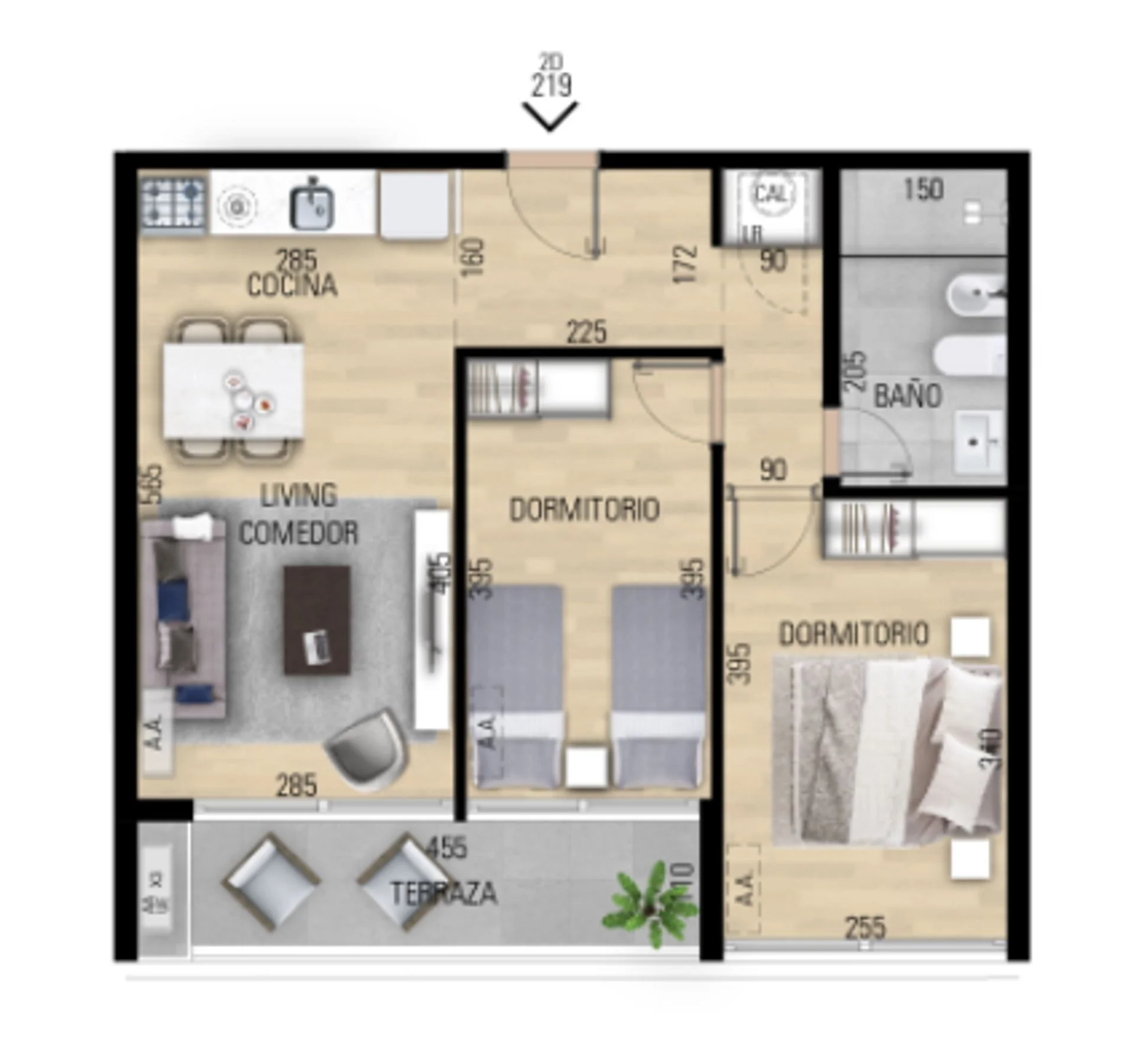 Apartamento unidad 219 en el segundo piso con orientacion Sur.