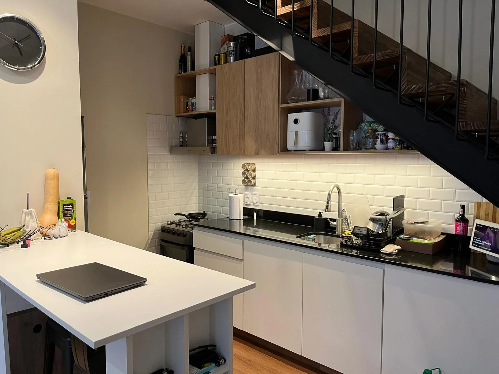 Cuenta con dos dormitorios en la planta superior, el principal con vestidor y salida al balcón. Ambos con persianas. En planta baja se encuentra el baño y un living con cocina integrada y barra.