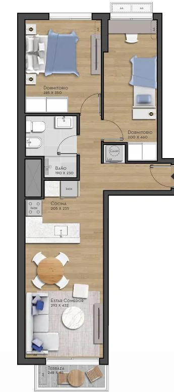 - Living Comedor con Cocina Integrada, salida a Terraza.