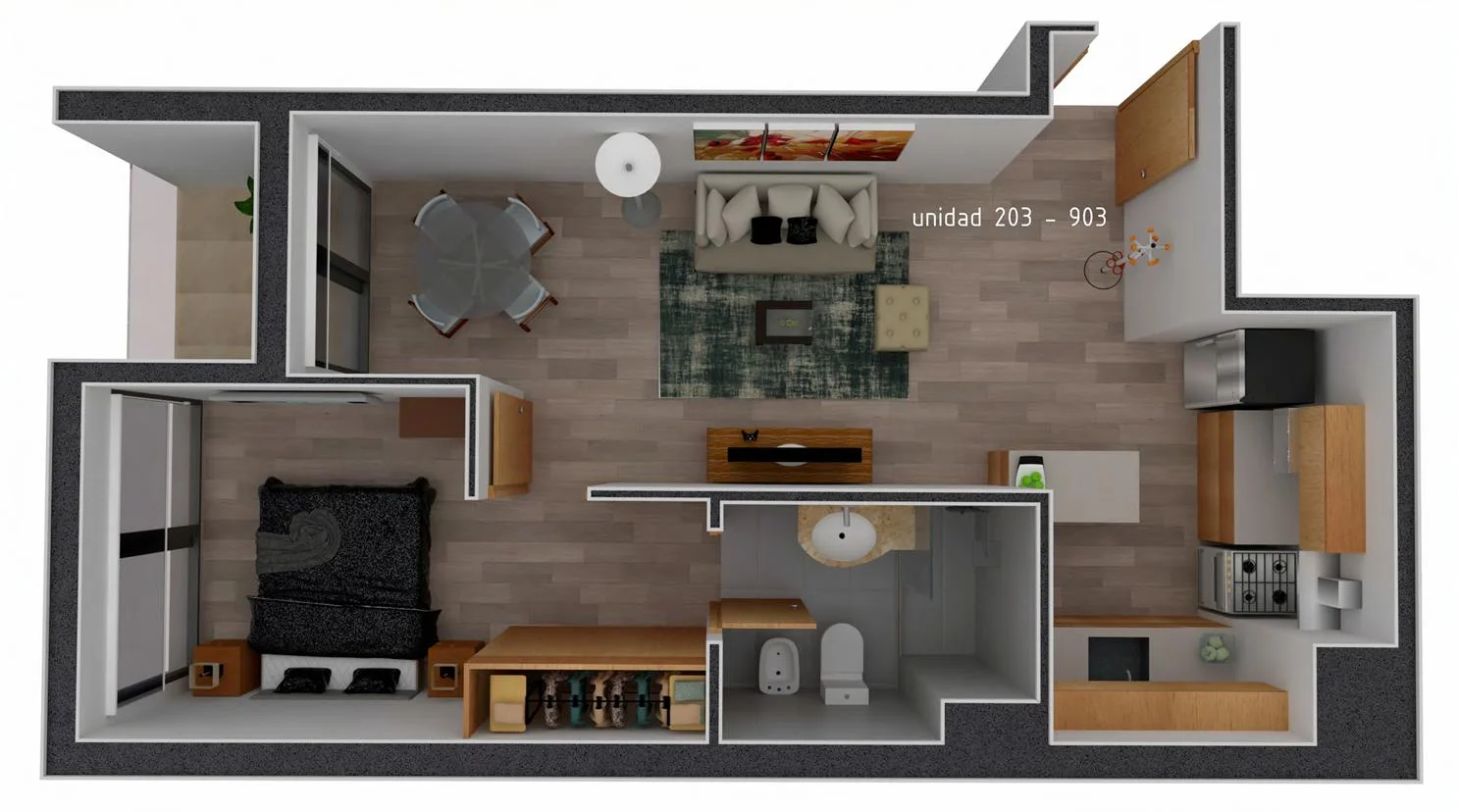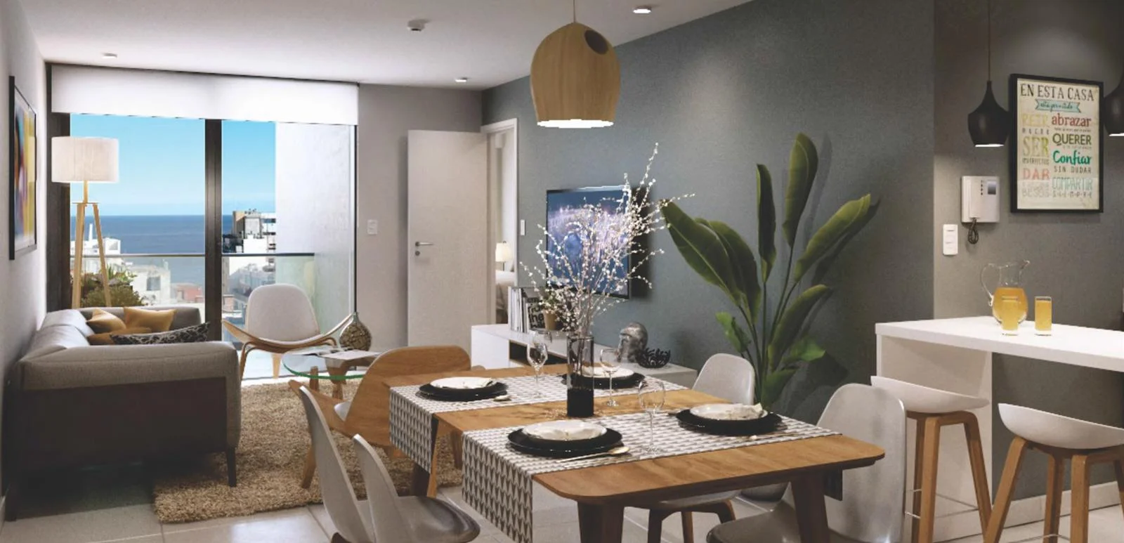 - Living Comedor (salida a balcón) con Cocina Integrada.