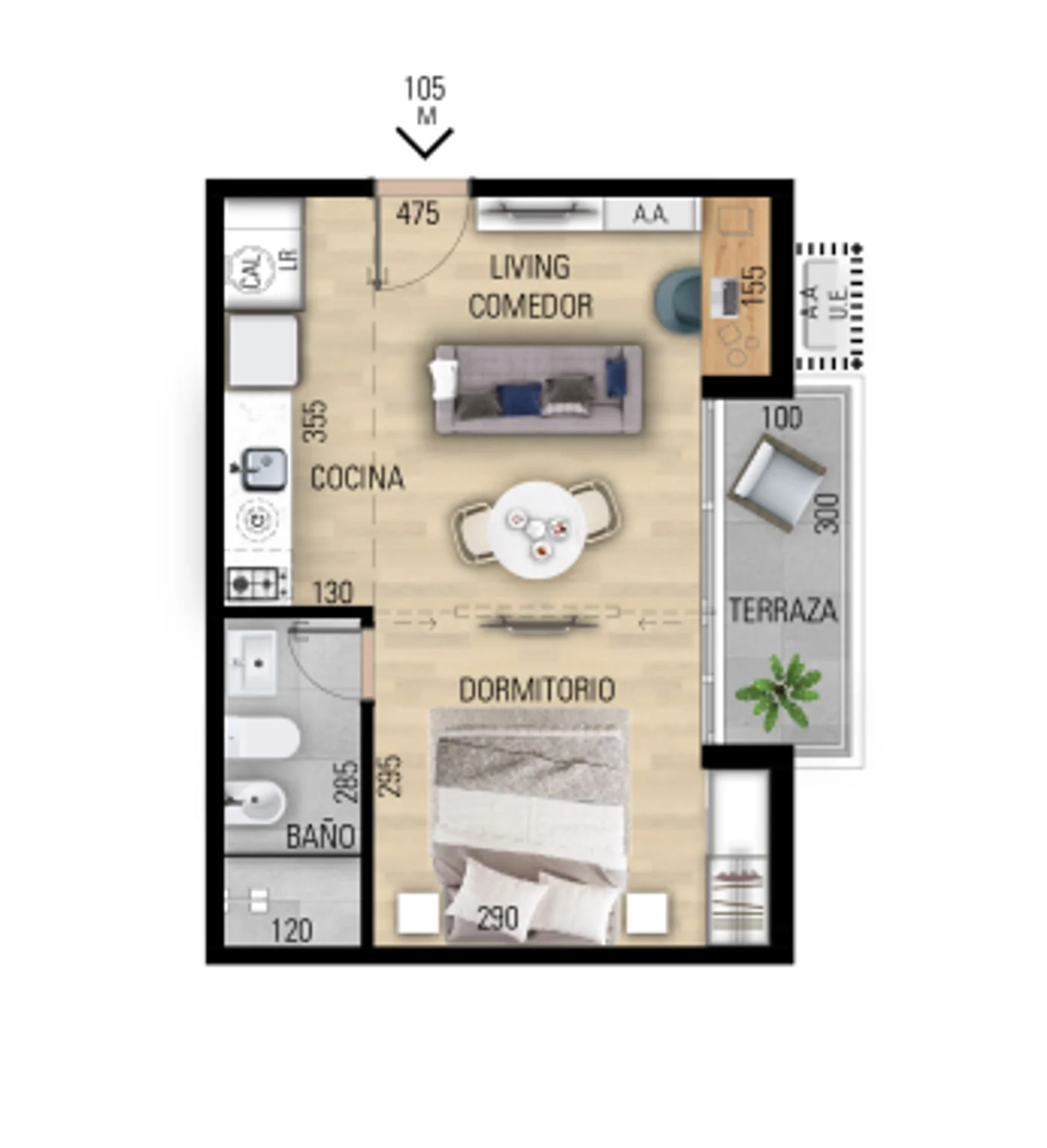 Cocina integrada con muebles aéreos, bajo mesada y anafe. Baño completo. Previsión de aire acondicionado en living y dormitorio. Aberturas de aluminio, terminación color negro con cortina de enrollar integrada, pavimento vinílico de alta resistencia en listones símil madera.