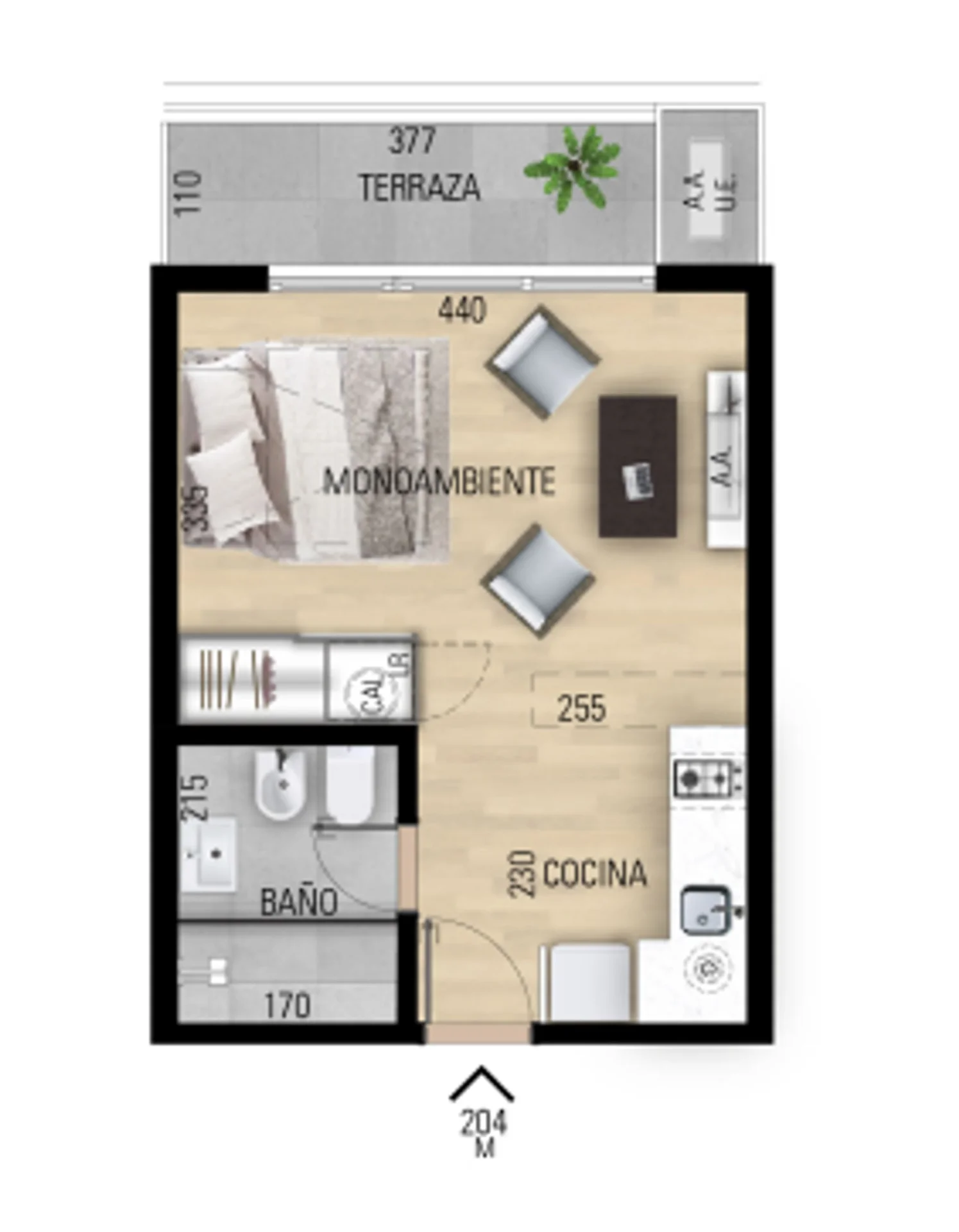 Cocina integrada con muebles aéreos, bajo mesada y anafe. Baño completo. Previsión de aire acondicionado en living y dormitorio. Aberturas de aluminio, terminación color negro con cortina de enrollar integrada, pavimento vinílico de alta resistencia en listones símil madera.