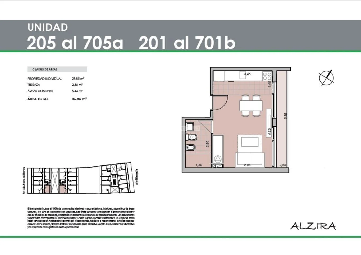 METRAJE: 28,85m área propia + 5,44m área común + 2,56m área terraza = 36,85m totales.