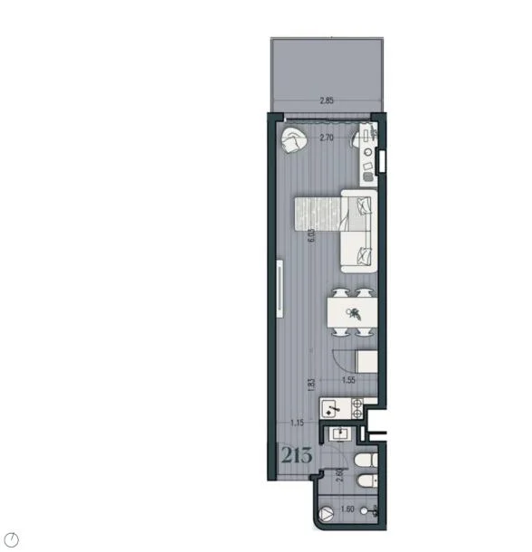 El apartamento monoambiente, ubicado en el piso 2 hacia el contrafrente del edificio con orientación Norte, cuenta con living-comedor, cocina integrada, mobiliario bajo mesada y aéreos, baño completo con instalación para lavarropas.