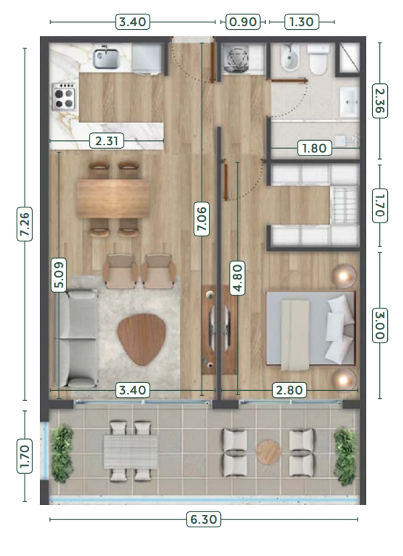 Living comedor con cocina integrada y salida a terraza.