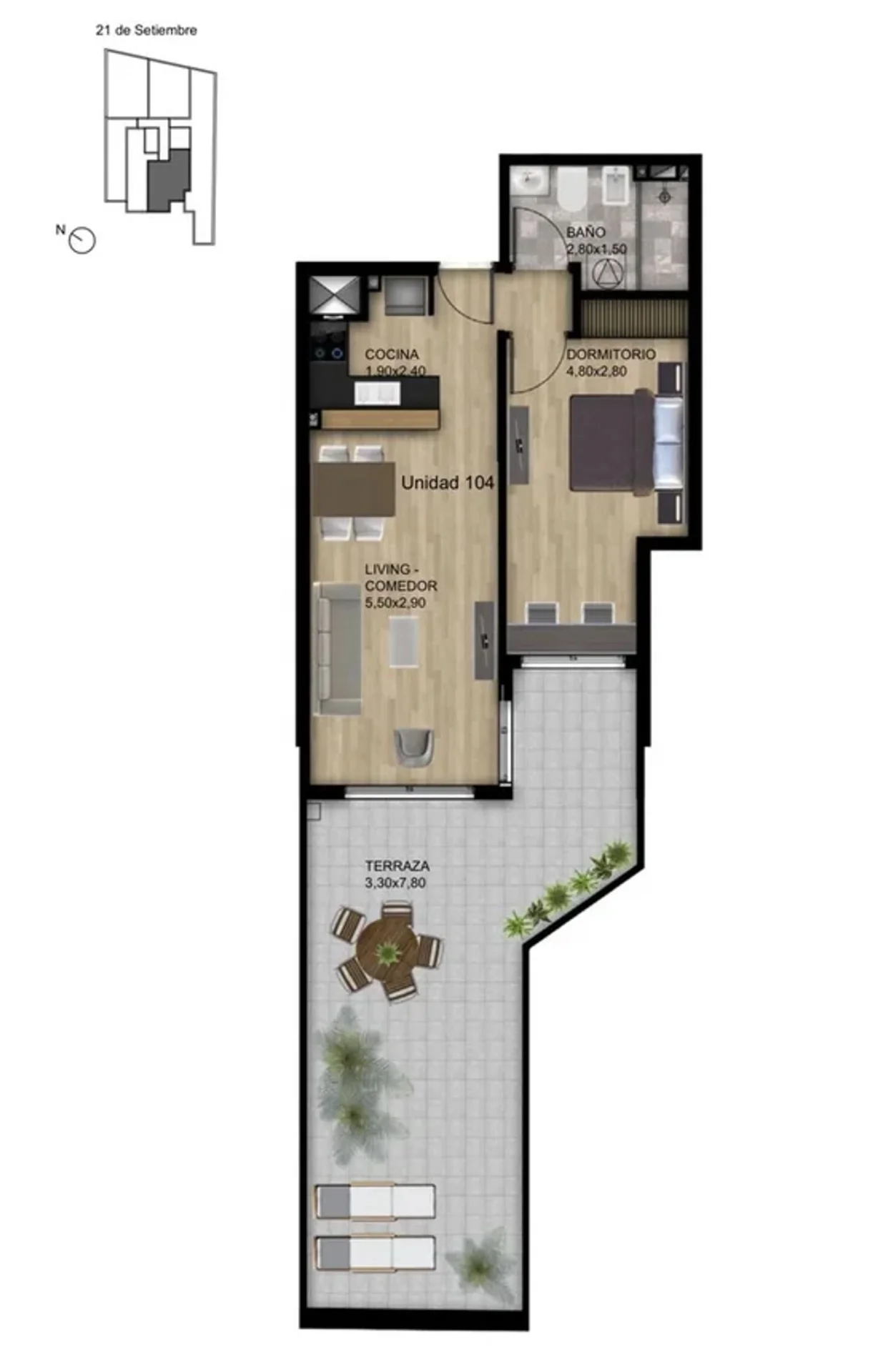 Piso 1 orientado al contrafrente con patio de 35 m2.