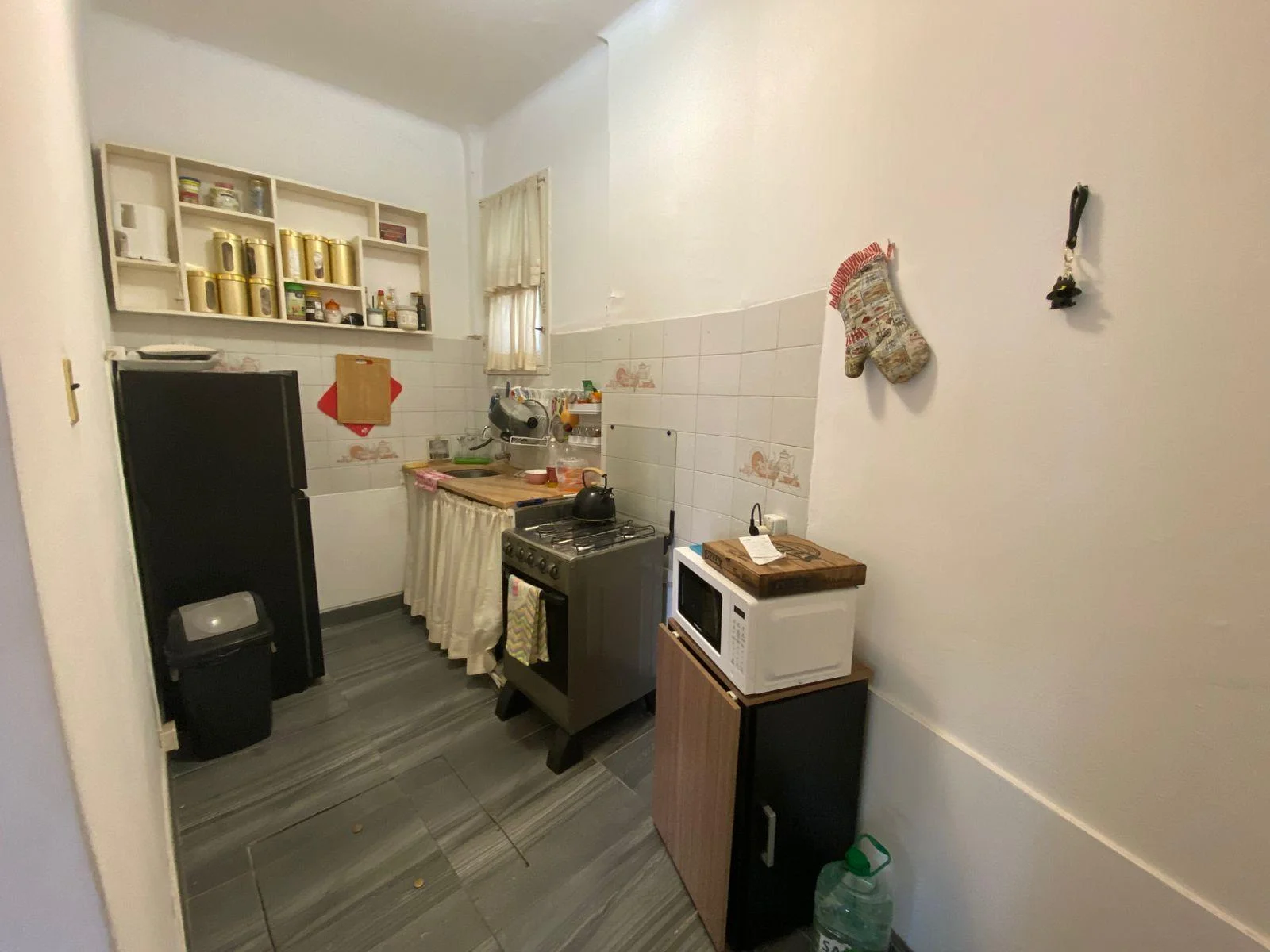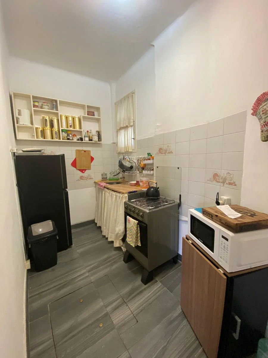 Cocina con bajo mesada y puerta de acceso al hall del edificio