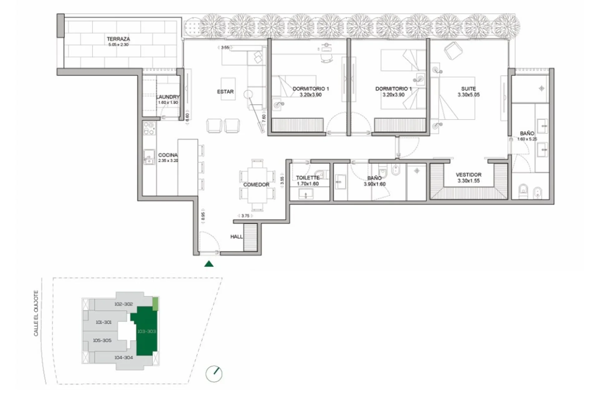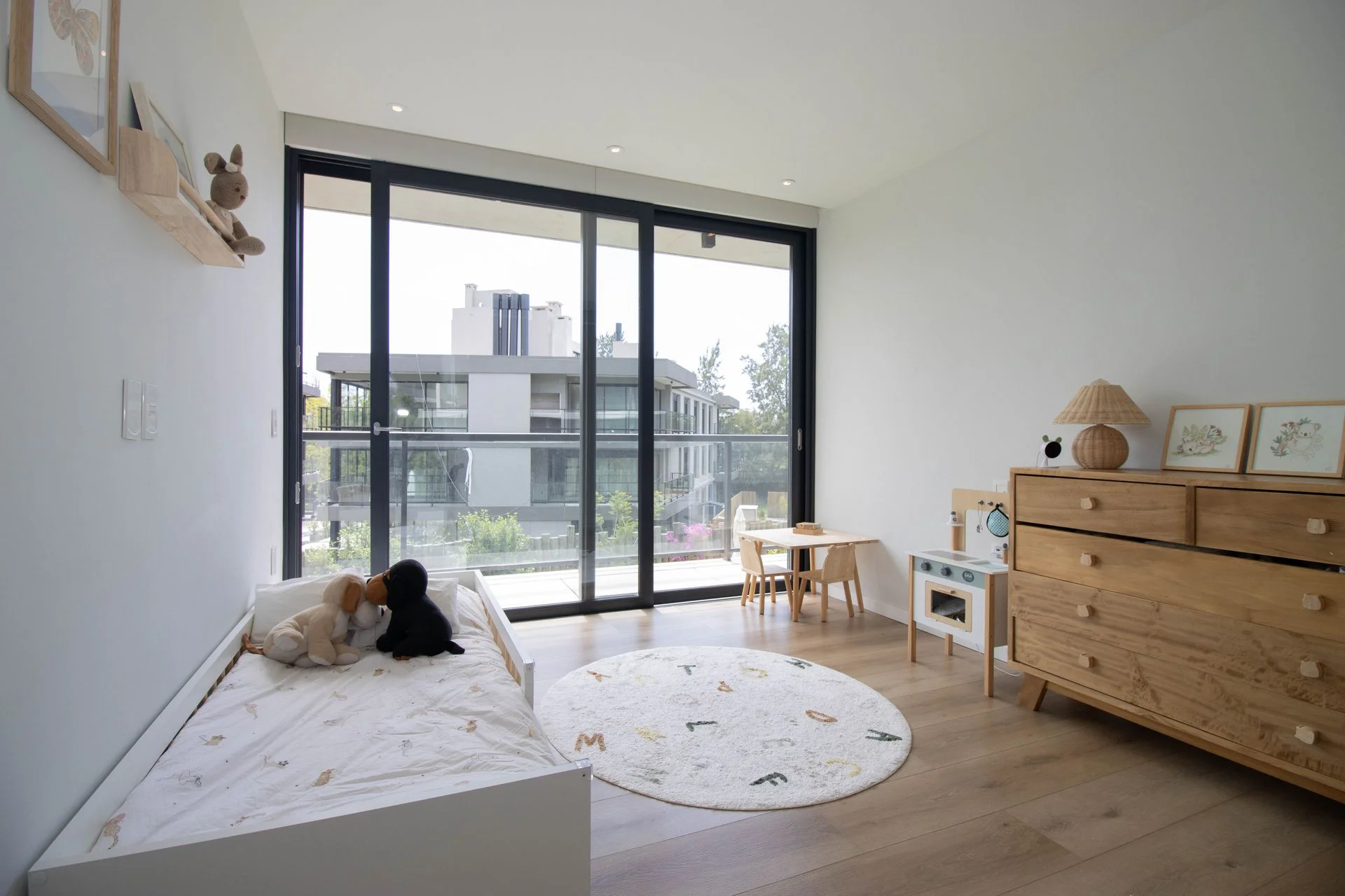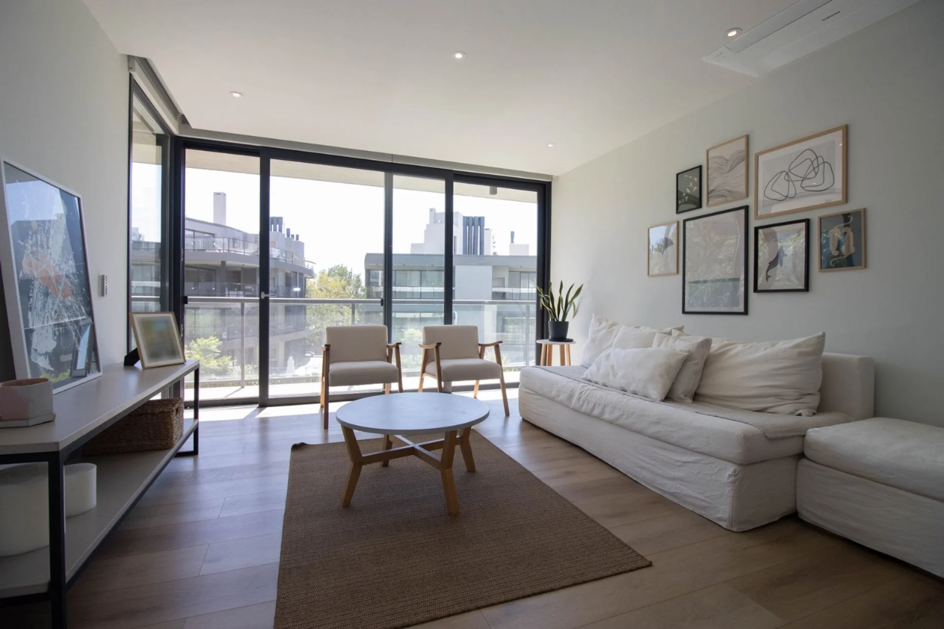 Ubicado en Barrio Parques, la unidad cuenta con 3 dormitorios de generosas dimensiones. El dormitorio principal incluye un vestidor. Dispone de dos baños completos con terminaciones sobrias y elegantes, además de un toilette para visitas.