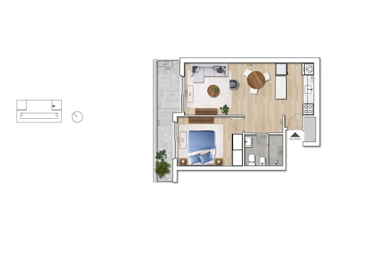 Living comedor con terraza, cocina integrada con placares y campana, placard para lavarropas, 1 dormitorio con placares y 1 baño completo.