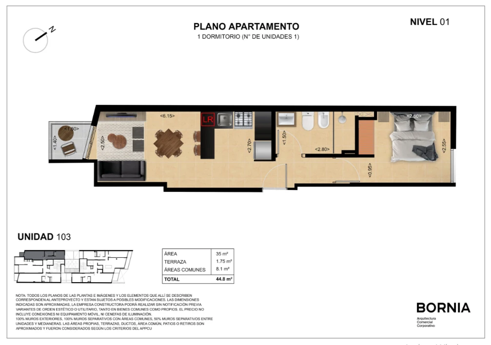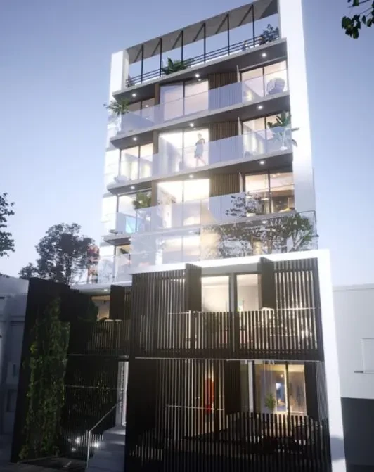 Se desarrolla en una torre de 6 pisos con un total de 33 apartamentos monoambientes, 1 y 2 dormitorios todos con terraza, es un proyecto arquitectónico moderno y funcional.