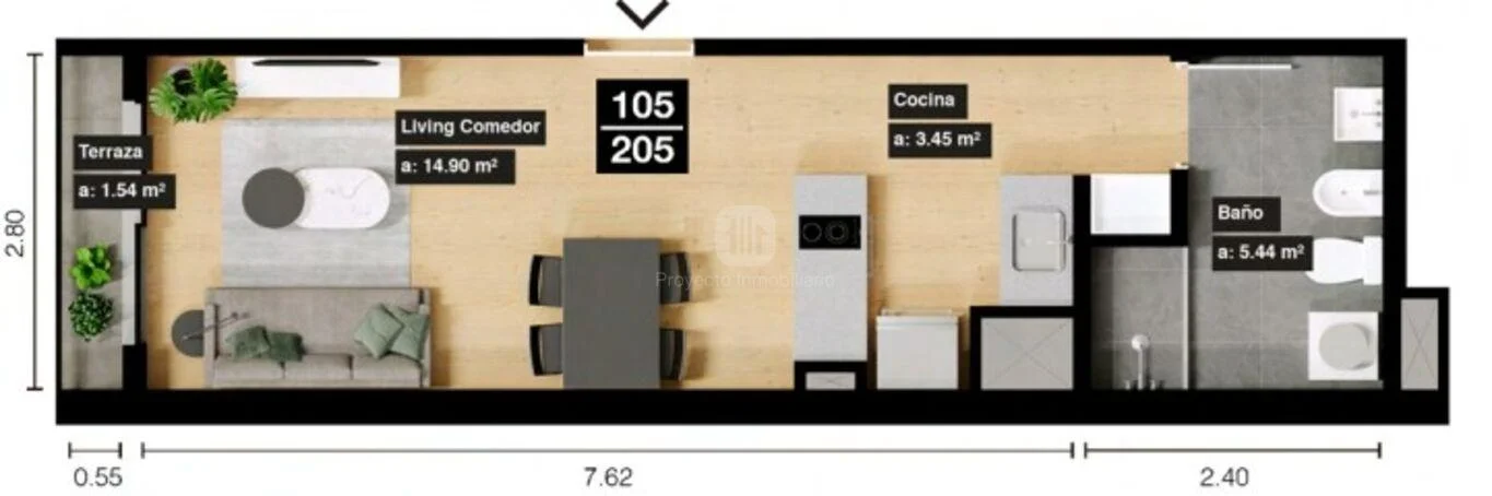Monoambiente, living comedor con acceso a terraza y cocina integrada
