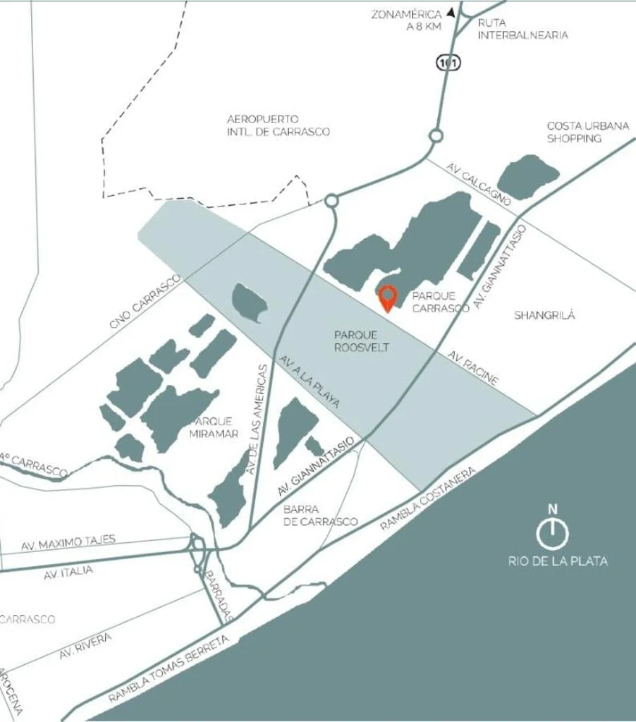 Ubicado en un entorno privilegiado entre los Lagos de Calcagno y el gran Parque Roosevelt a minutos del centro de Carrasco, colegios, clubes y Centro comerciales.