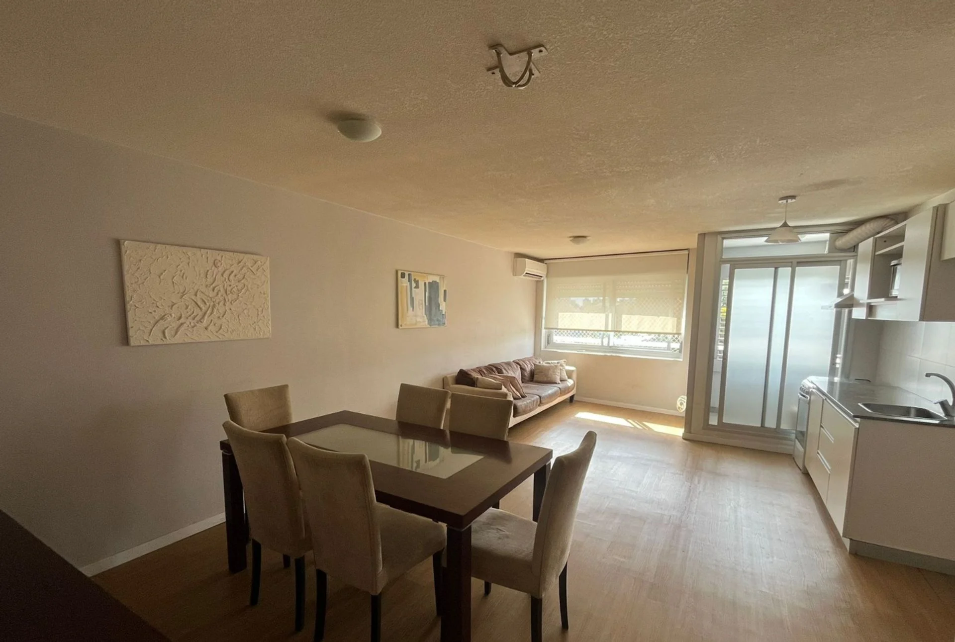 - Living comedor amplio con cocina integrada y acceso a terraza lavadero. Cuenta con cortina roller y aire acondicionado.