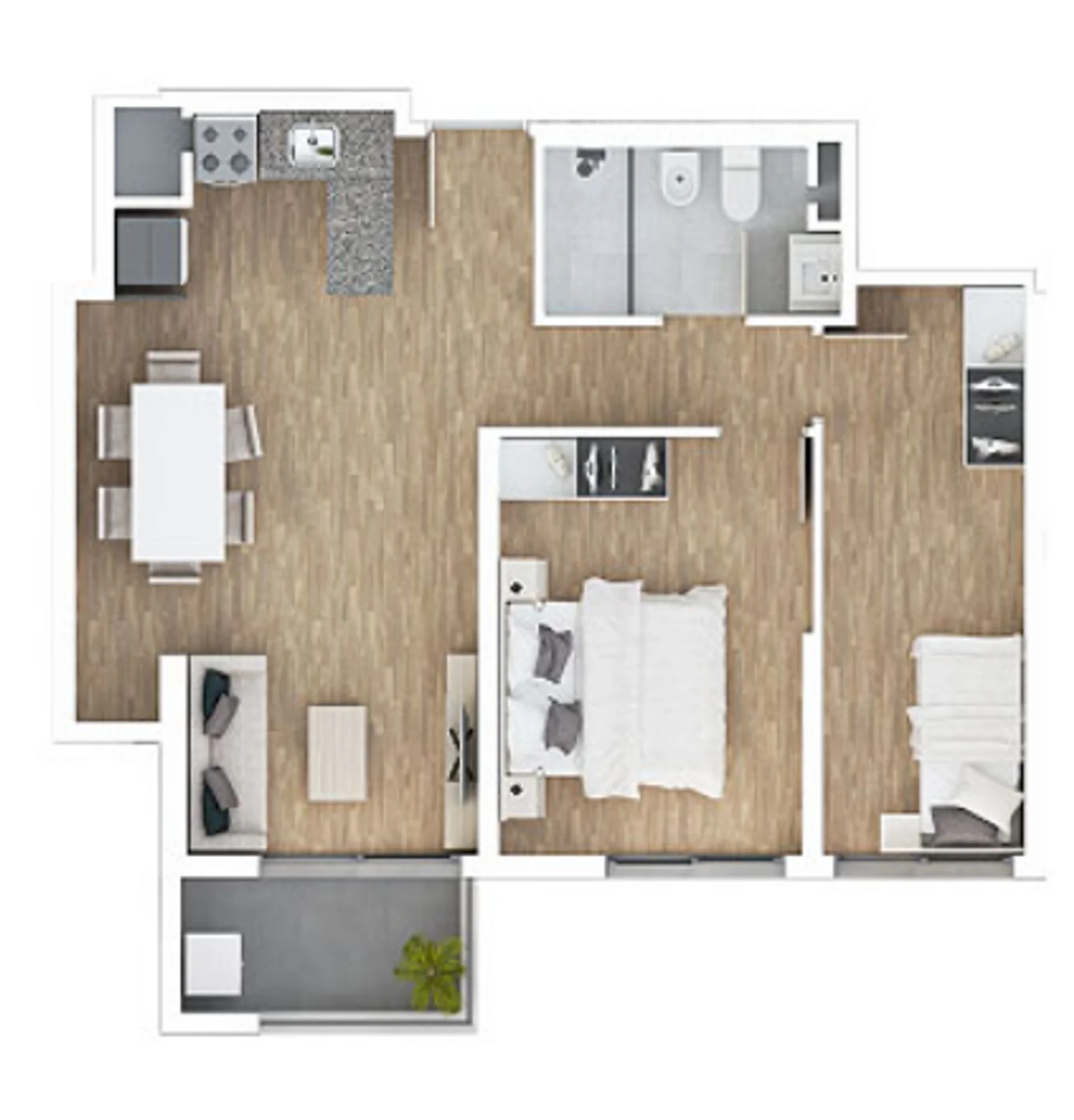 Área propia: 54.45 mts2 (con ductos y muros), terraza: 2,34 mts2.