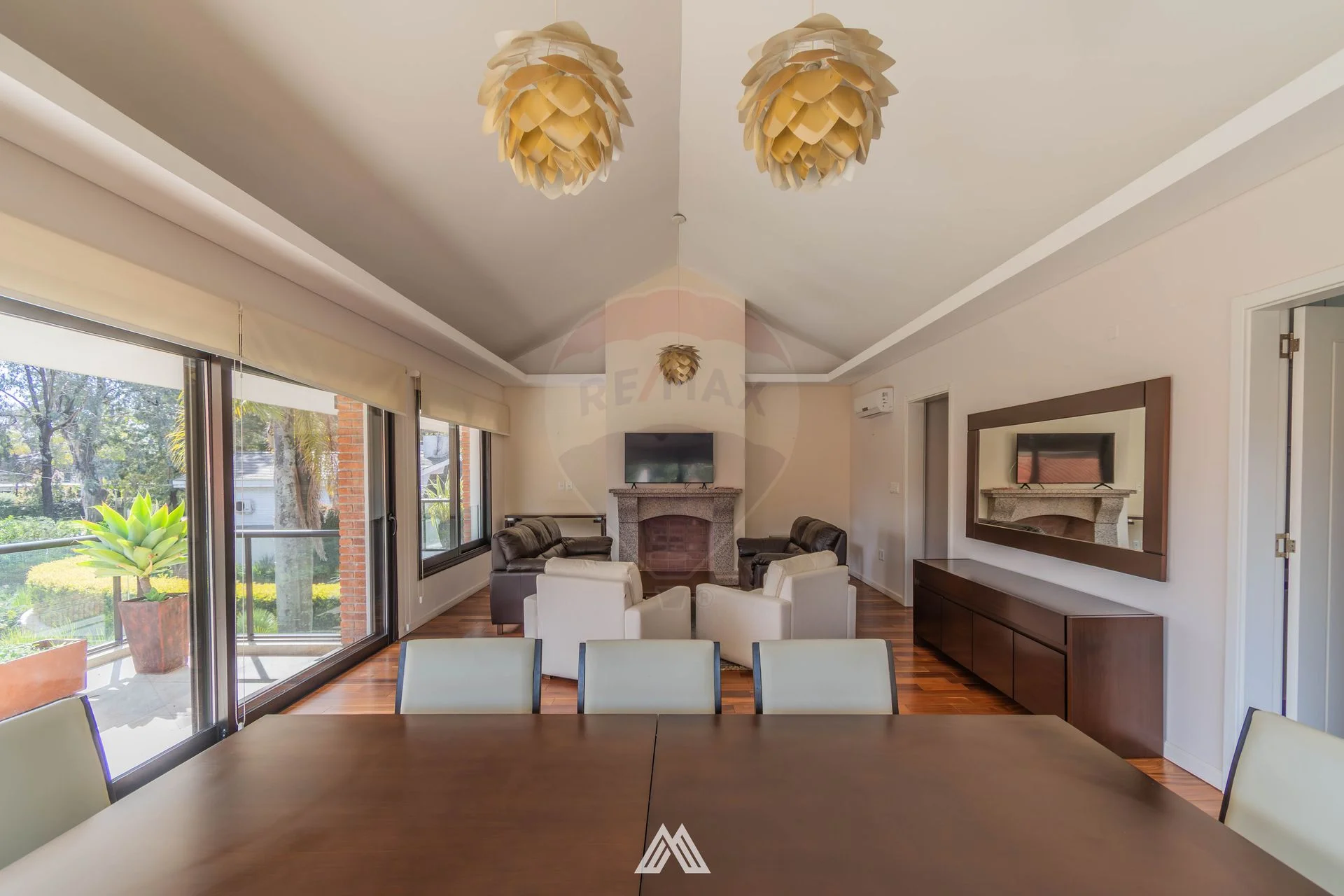 • Recepción de diseño que da la bienvenida a un living-comedor con cálida estufa a leña y hermosos ventanales que se abren a una gran terraza.