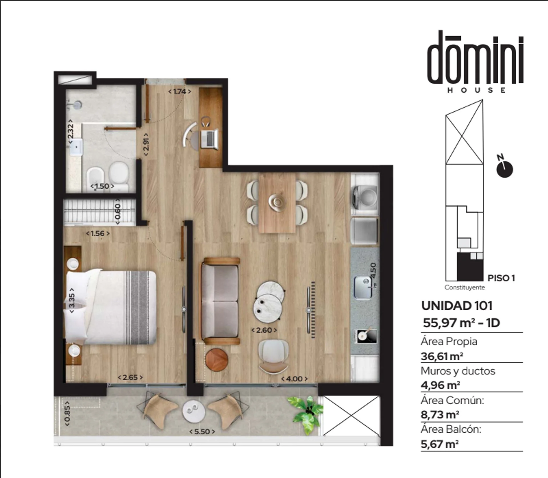 La unidad cuenta con 36,61 m2 edificados y 5,67 m2 de terraza. Al entrar al apartamento con encontramos con el baño y un área de escritorio, al frente se encuentra el dormitorio con salida a la terraza. Hacia la izquierda nos encontramos el living comedor y cocina que también con salida a la terraza.