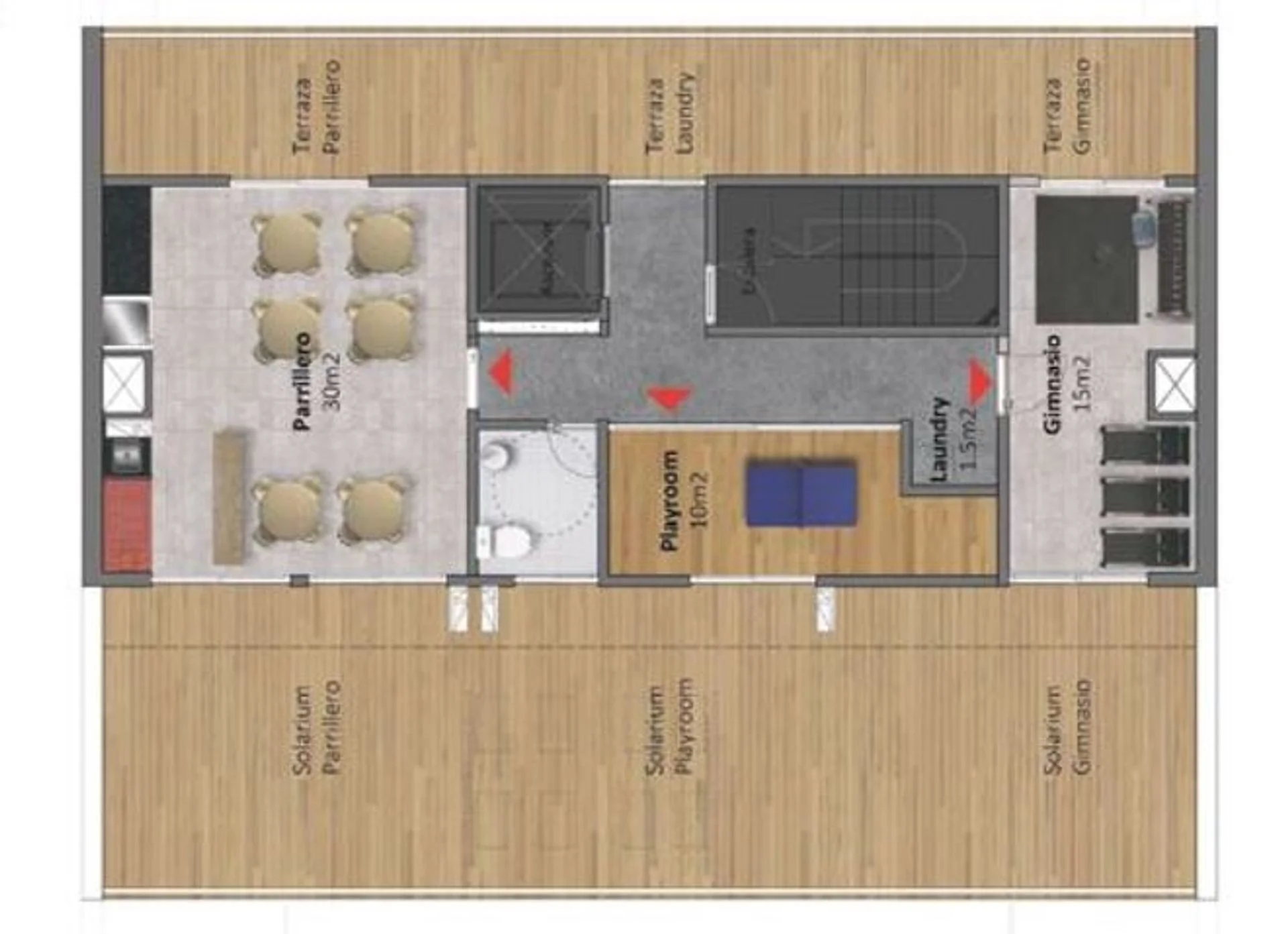 En el último nivel el edificio posee un parrillero, gimnasio, playroom todos con salida al solárium y con terraza al frente y contrafrente del edificio. Además contará con Laundry.
