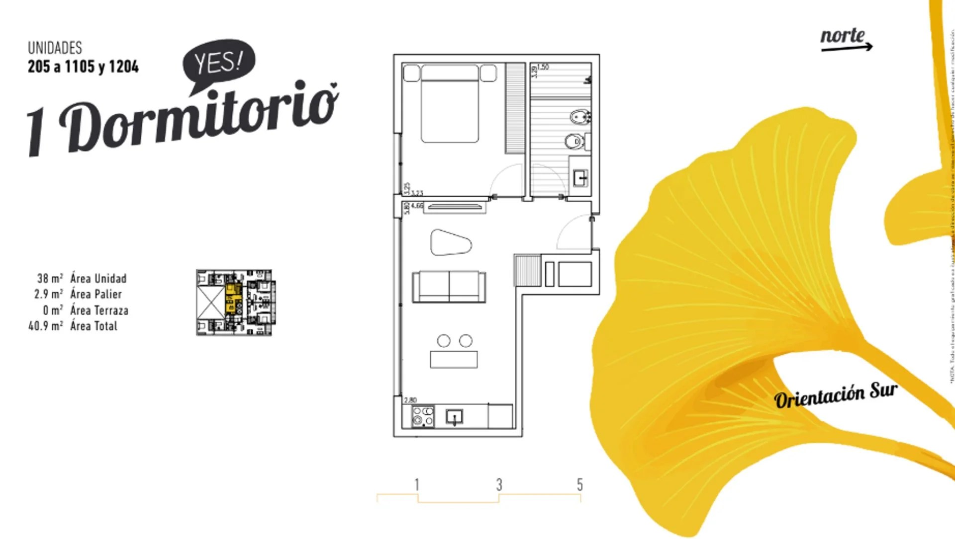 La unidad cuenta con 38 m2 edificados distribuidos de la siguiente manera: al entrar nos encontramos con el baño y una área destinada a guardado, mas adelante nos encontramos con el dormitorio, el living comedor y la cocina.